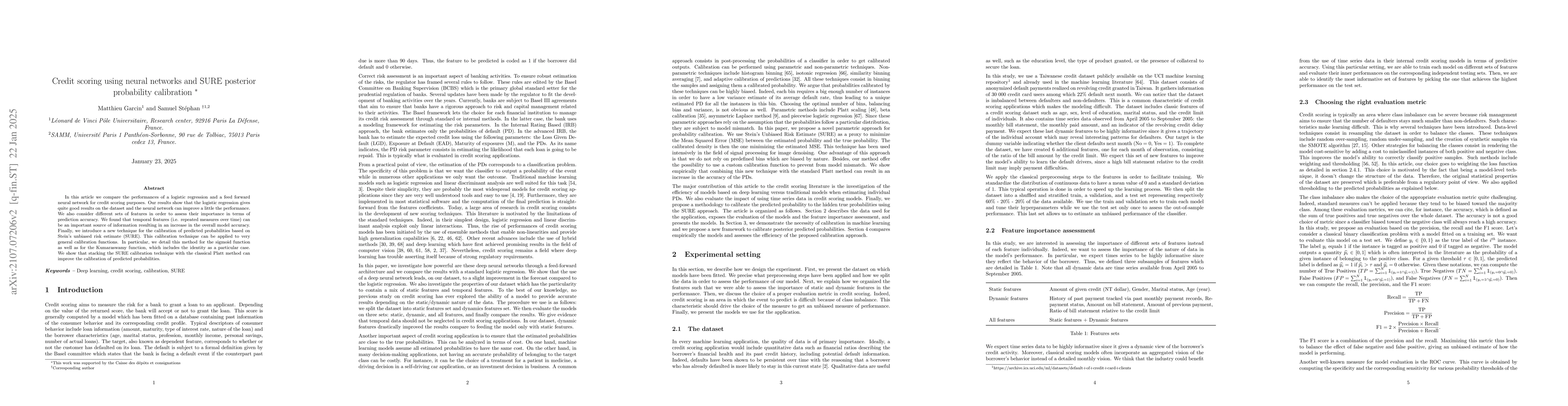 In this article we compare the performances of a logistic regression and a feed forward neural network for credit scoring purposes. Our results show that the logistic regression gives quite good results on the dataset and the neural network can improve a little the performance. We also consider different sets of features in order to assess their importance in terms of prediction accuracy. We found that temporal features (i.e. repeated measures over time) can be an important source of information resulting in an increase in the overall model accuracy. Finally, we introduce a new technique for the calibration of predicted probabilities based on Stein's unbiased risk estimate (SURE). This calibration technique can be applied to very general calibration functions. In particular, we detail this method for the sigmoid function as well as for the Kumaraswamy function, which includes the identity as a particular case. We show that stacking the SURE calibration technique with the classical Platt method can improve the calibration of predicted probabilities.