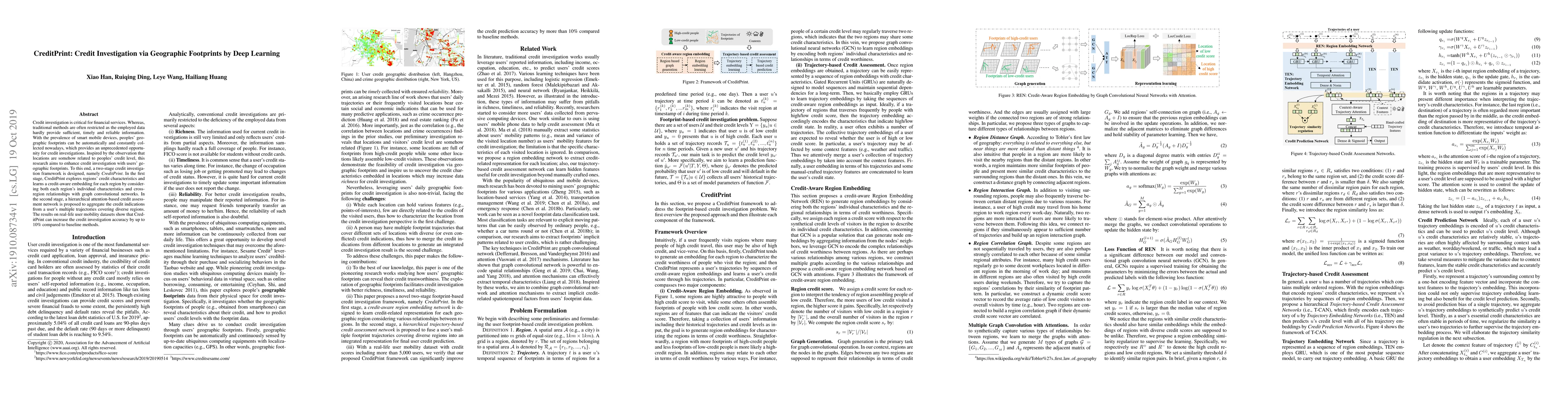 CreditPrint uses deep learning to enhance credit investigation by analyzing users' geographic footprints. It employs graph convolutional networks to learn regional credit characteristics and a hierarchical attention-based network to aggregate credit indications from users' mobility data, achieving up to a 10% improvement in accuracy over traditional methods.
