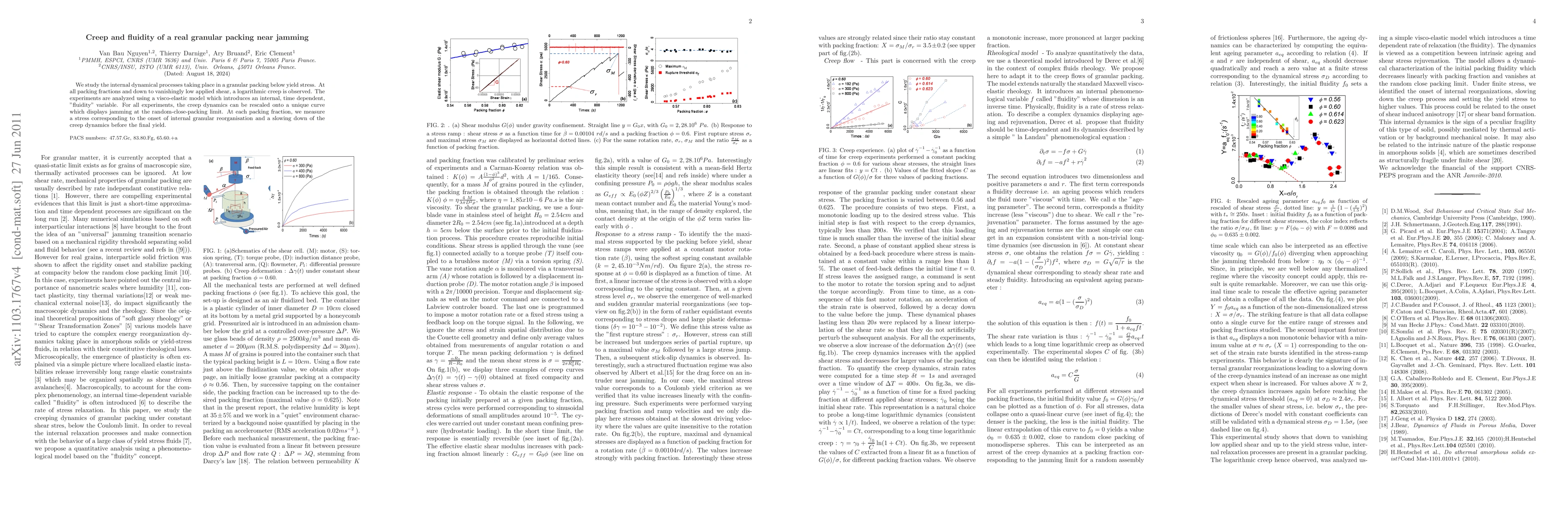 We study the internal dynamical processes taking place in a granular packing below yield stress. At all packing fractions and down to vanishingly low applied shear, a logarithmic creep is evidenced. The experiments are analyzed under the scope of a visco-elastic model introducing an internal "fluidity" variable. For all experiments, the creep dynamics can be rescaled onto a unique curve which displays jamming at the random-close-packing limit. At each packing fraction, a stress value is evidenced, corresponding to the onset of internal granular reorganisation leading to a slowing down the creep dynamics before the final yield.
