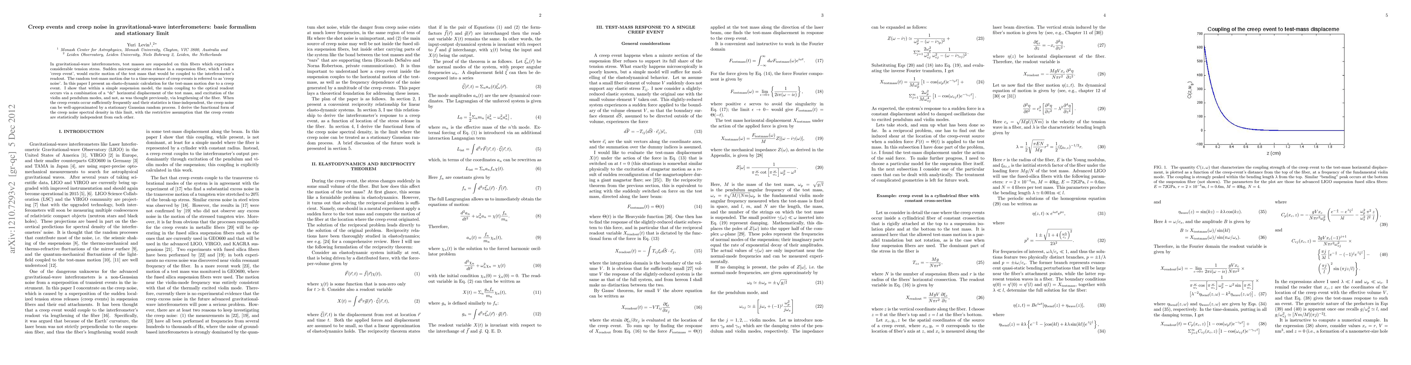 Gravitational-wave interferometers can detect 'creep noise' caused by microscopic stress releases in suspension fibers, which excite test mass motion, affecting the readout. The creep noise can be approximated as a stationary Gaussian random process when events occur frequently and independently.