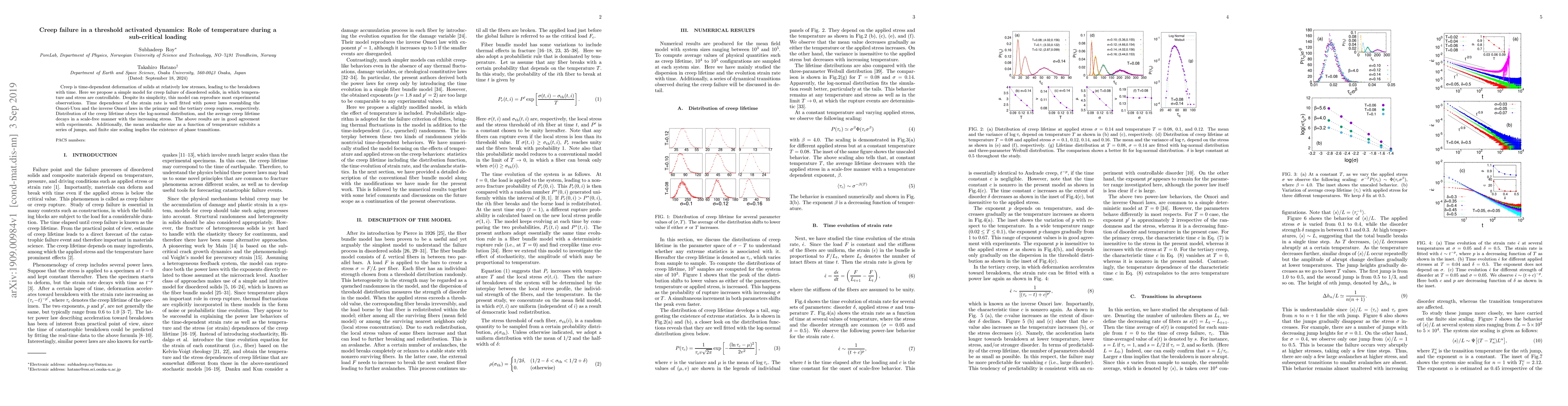 This paper proposes a simple model to study creep failure in disordered solids under sub-critical loading, showing that temperature and stress significantly influence the time-dependent deformation. The model accurately reproduces experimental observations, including the power-law behavior of strain rates and log-normal distribution of creep lifetimes.