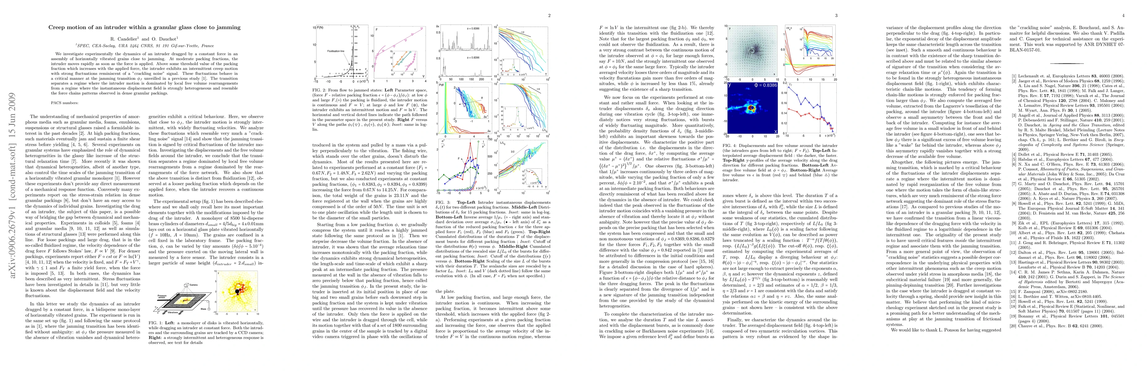 We investigate experimentally the dynamics of an intruder dragged by a constant force in an assembly of horizontally vibrated grains close to jamming. At moderate packing fractions, the intruder moves rapidly as soon as the force is applied. Above some threshold value of the packing fraction which increases with the applied force, the intruder exhibits an intermittent creep motion with strong fluctuations reminiscent of a crackling noise signal. These fluctuations behave in a critical manner at the jamming transition unveilled in a previous study. The transition separates a regime where the intruder motion is dominated by local free volume rearrangements from a regime where the instantaneous displacement field is strongly heterogeneous and resemble the force chains patterns observed in dense granular packings.