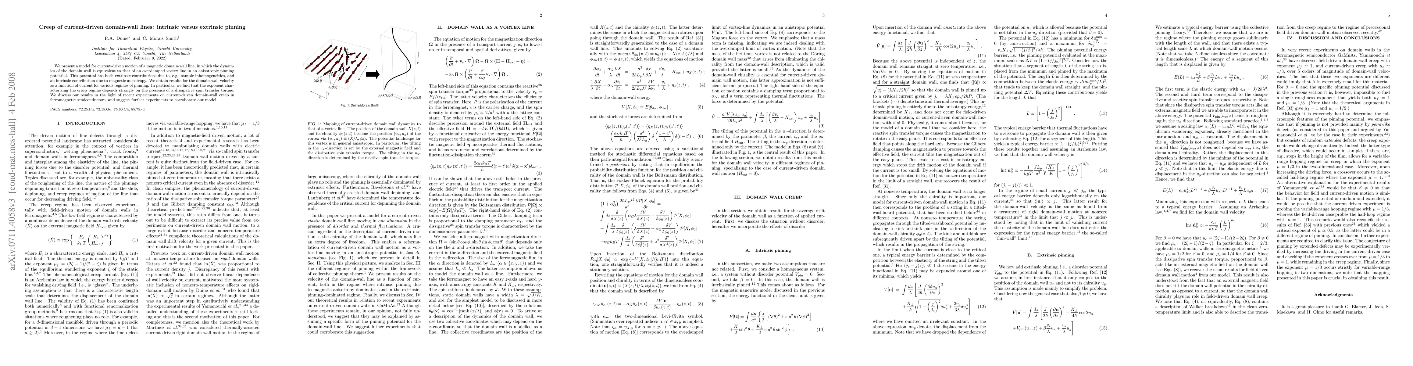 We present a model for current-driven motion of a magnetic domain-wall line, in which the dynamics of the domain wall is equivalent to that of an overdamped vortex line in an anisotropic pinning potential. This potential has both extrinsic contributions due to, e.g., sample inhomogeneities, and an intrinsic contribution due to magnetic anisotropy. We obtain results for the domain-wall velocity as a function of current for various regimes of pinning. In particular, we find that the exponent characterizing the creep regime depends strongly on the presence of a dissipative spin transfer torque. We discuss our results in the light of recent experiments on current-driven domain-wall creep in ferromagnetic semiconductors, and suggest further experiments to corroborate our model.