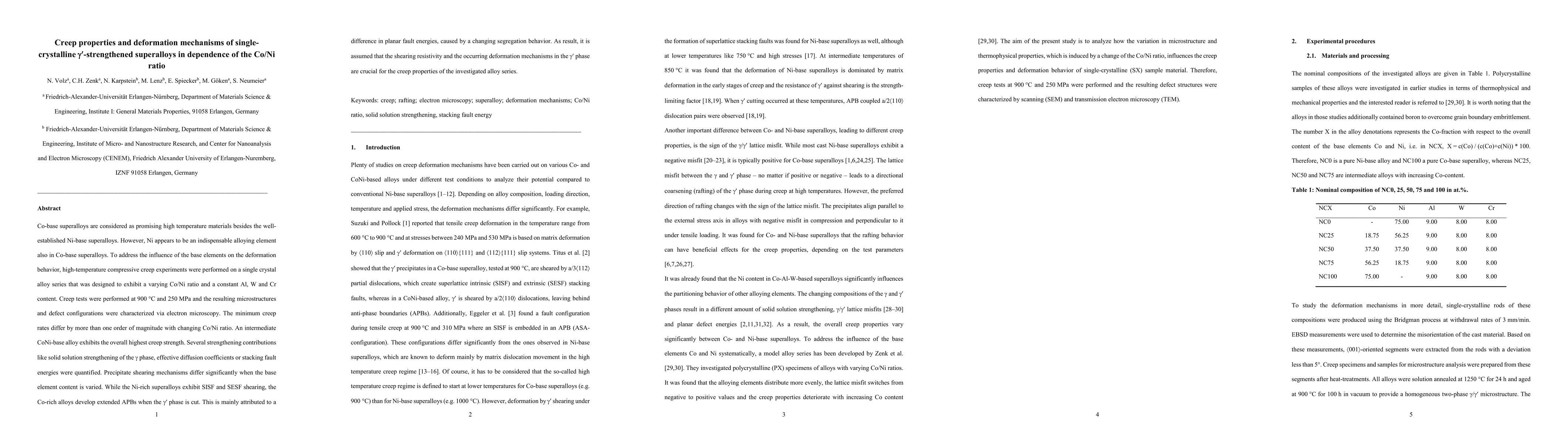 This paper investigates the creep properties of single-crystalline $\gamma^\prime$-strengthened superalloys with varying Co/Ni ratios, revealing significant differences in minimum creep rates and deformation mechanisms. An intermediate CoNi alloy shows the highest creep strength, attributed to differences in planar fault energies and segregation behavior affecting the shearing resistivity of the $\gamma^\prime$ phase.