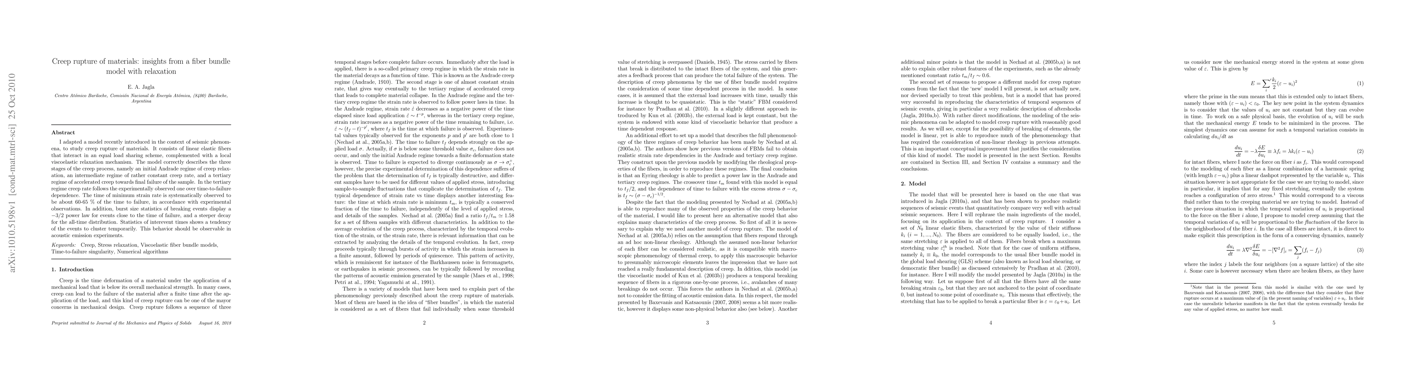 A fiber bundle model with relaxation mechanisms was adapted to study creep rupture of materials, describing three stages of creep: initial Andrade regime, constant creep rate, and accelerated creep towards failure.