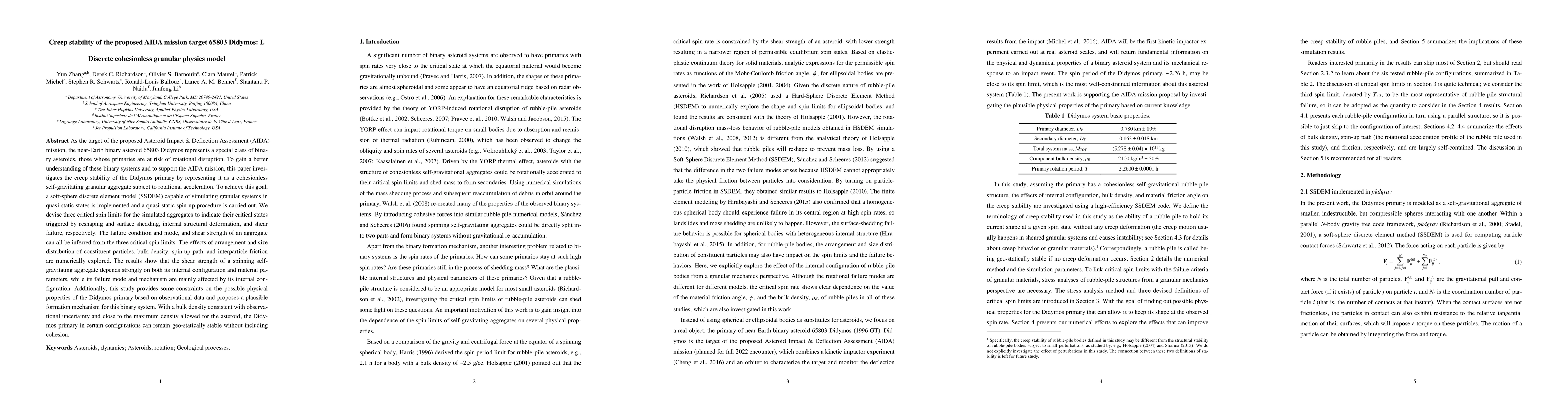 This study investigates the creep stability of the Didymos asteroid using a discrete cohesionless granular physics model, revealing that its shear strength depends strongly on internal configuration and material parameters, with possible formation mechanisms proposed based on observational data.