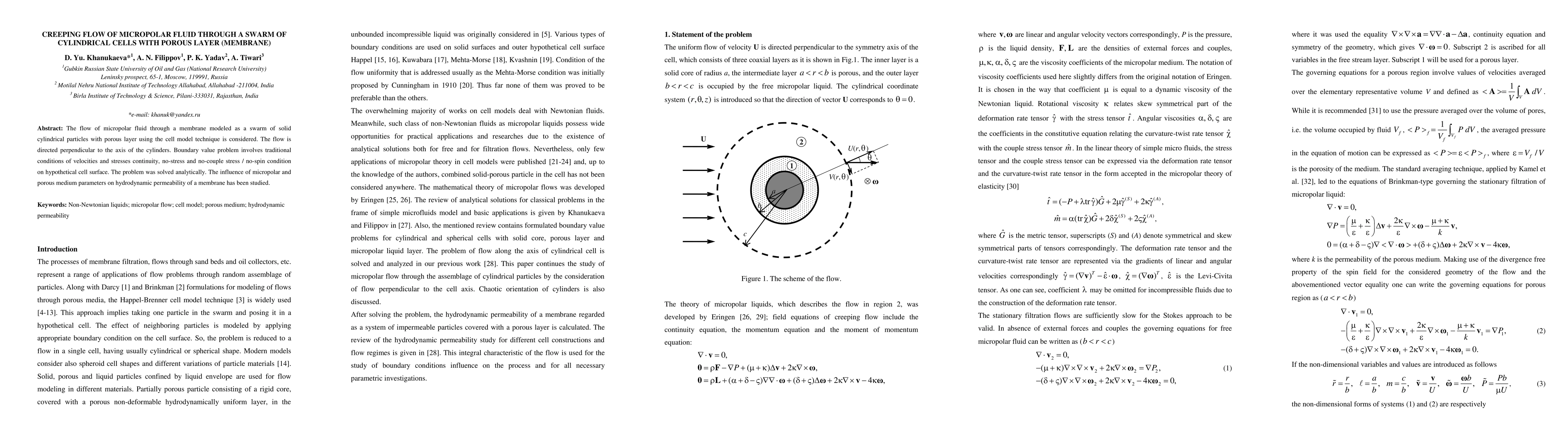 The paper presents a comprehensive analytical solution for the creeping flow of micropolar fluids through porous layers modeled as cylindrical cells, providing insights into hydrodynamic permeability.