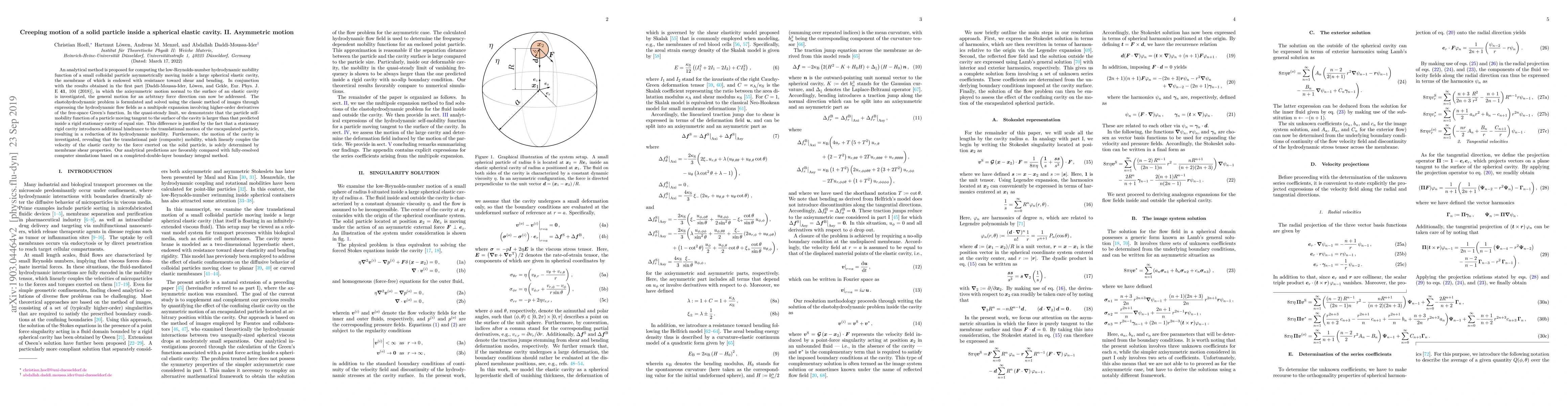 An analytical method is proposed for computing the low-Reynolds-number hydrodynamic mobility function of a small colloidal particle asymmetrically moving inside a large spherical elastic cavity, the membrane of which is endowed with resistance toward shear and bending. In conjunction with the results obtained in the first part [Daddi-Moussa-Ider, L\"{o}wen, and Gekle, Eur. Phys. J. E 41, 104 (2018)], in which the axisymmetric motion normal to the surface of an elastic cavity is investigated, the general motion for an arbitrary force direction can be addressed. The elastohydrodynamic problem is formulated and solved using the classic method of images through expressing the hydrodynamic flow fields as a multipole expansion involving higher-order derivatives of the free-space Green's function. In the quasi-steady limit, we demonstrate that the particle self-mobility function of a particle moving tangent to the surface of the cavity is larger than that predicted inside a rigid stationary cavity of equal size. This difference is justified by the fact that a stationary rigid cavity introduces additional hindrance to the translational motion of the encapsulated particle, resulting in a reduction of its hydrodynamic mobility. Furthermore, the motion of the cavity is investigated, revealing that the translational pair (composite) mobility, which linearly couples the velocity of the elastic cavity to the force exerted on the solid particle, is solely determined by membrane shear properties. Our analytical predictions are favorably compared with fully-resolved computer simulations based on a completed-double-layer boundary integral method.