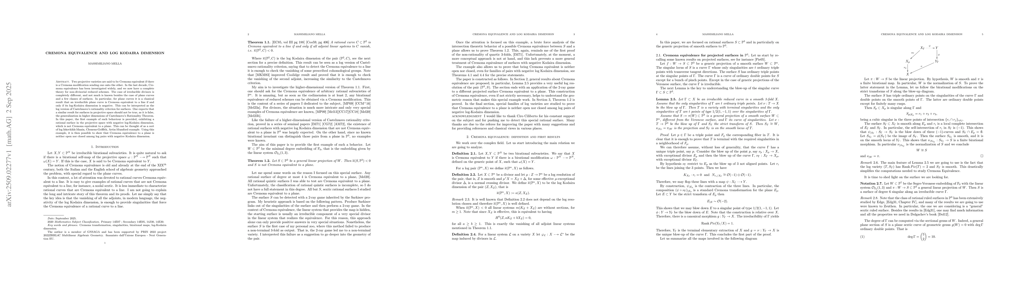 Two projective varieties are said to be Cremona equivalent if there is a Cremona modification sending one onto the other. In the last decade, Cremona equivalence has been investigated widely, and we now have a complete theory for non-divisorial reduced schemes. The case of irreducible divisors is completely different, and not much is known besides the case of plane curves and a few classes of surfaces. In particular, for plane curves it is a classical result that an irreducible plane curve is Cremona equivalent to a line if and only if its log-Kodaira dimension is negative. This can be interpreted as the log version of Castelnuovo's rationality criterion for surfaces. One expects that a similar result for surfaces in projective space should not be true, as it is false, the generalization in higher dimensions of Castelnuovo's Rationality Theorem. In this paper, the first example of such behaviour is provided, exhibiting a rational surface in the projective space with negative log-Kodaira dimension, which is not Cremona equivalent to a plane. This can be thought of as a sort of log Iskovkikh-Manin, Clemens-Griffith, Artin-Mumford example. Using this example, it is then possible to show that Cremona equivalence to a plane is neither open nor closed among log pairs with negative Kodaira dimension.