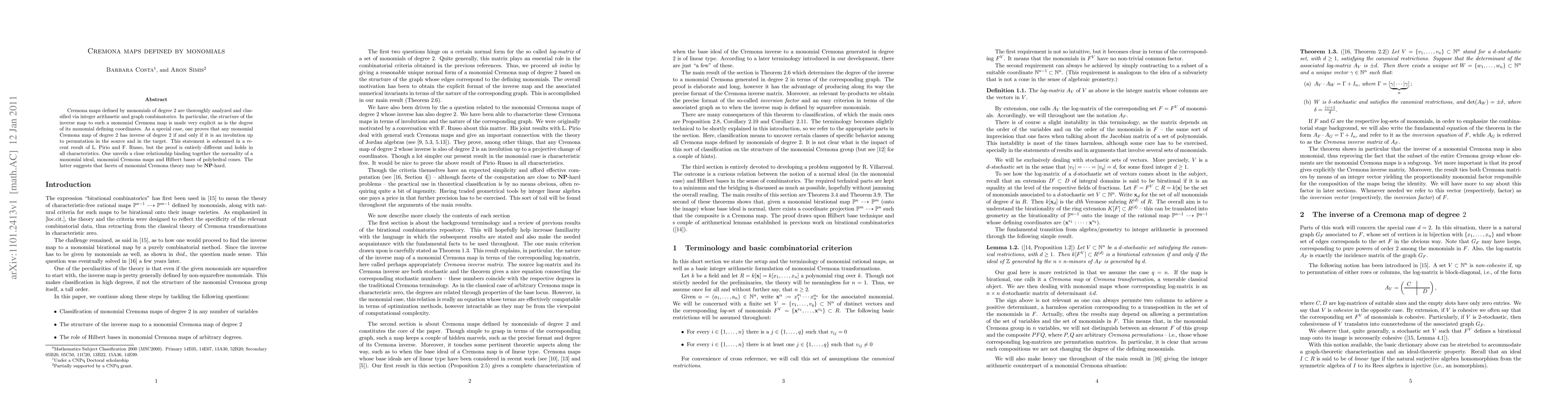 Cremona maps defined by monomials of degree 2 are thoroughly analyzed and classified via integer arithmetic and graph combinatorics. In particular, the structure of the inverse map to such a monomial Cremona map is made very explicit as is the degree of its monomial defining coordinates. As a special case, one proves that any monomial Cremona map of degree 2 has inverse of degree 2 if and only if it is an involution up to permutation in the source and in the target. This statement is subsumed in a recent result of L. Pirio and F. Russo, but the proof is entirely different and holds in all characteristics. One unveils a close relationship binding together the normality of a monomial ideal, monomial Cremona maps and Hilbert bases of polyhedral cones. The latter suggests that facets of monomial Cremona theory may be NP-hard.
