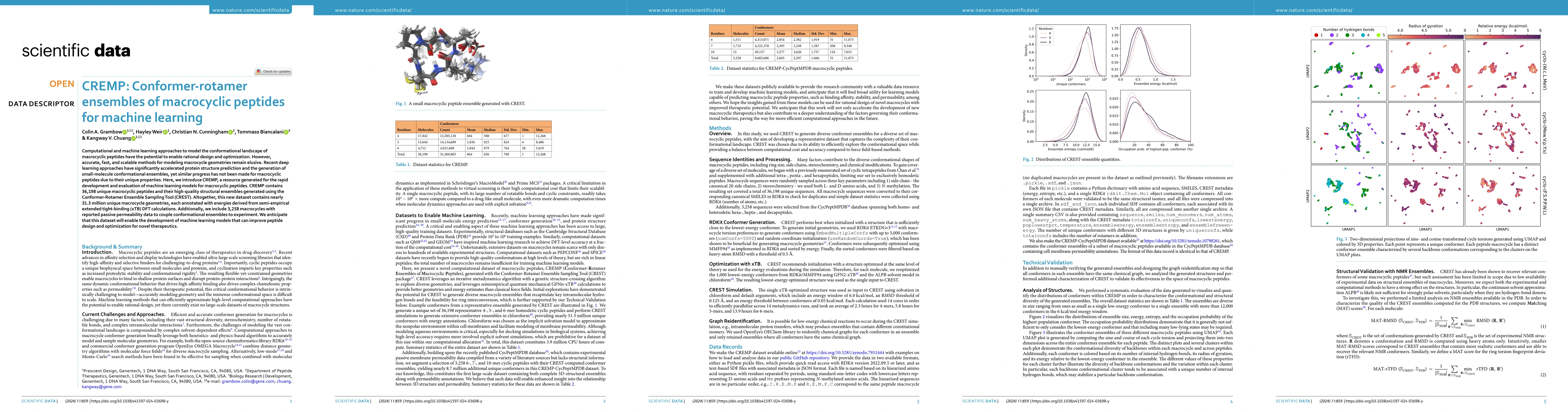 CREMP provides a comprehensive dataset of 36,198 macrocyclic peptides with nearly 31.3 million unique geometries, aiming to advance machine learning models for peptide design. The dataset includes high-quality structural ensembles and energy annotations, facilitating the development of predictive tools for therapeutic applications.