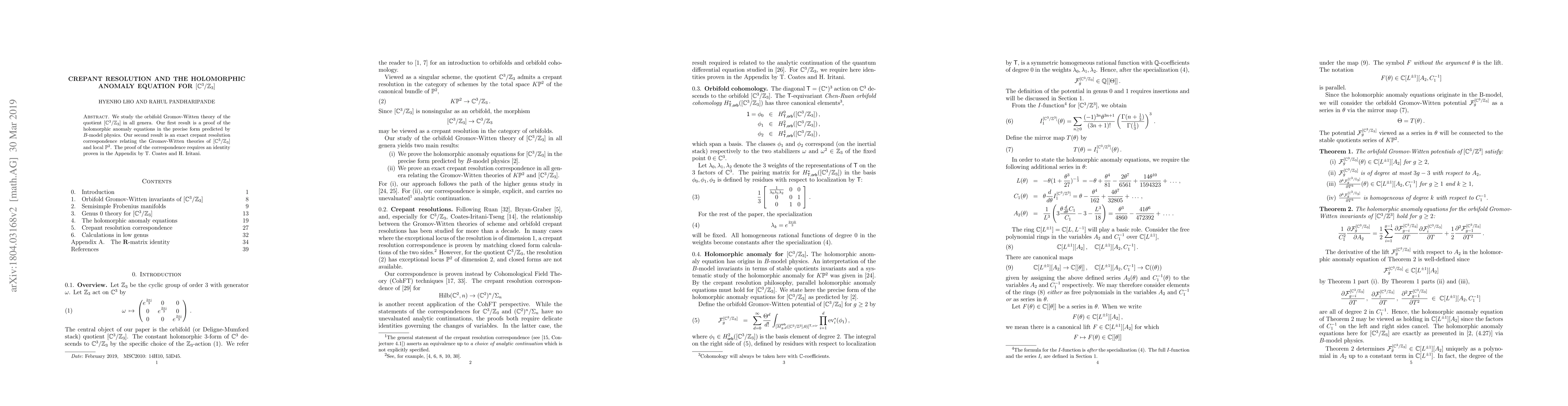 This paper proves the holomorphic anomaly equations for the orbifold C^3/Z_3, aligning with B-model physics predictions. It also establishes a crepant resolution correspondence linking the Gromov-Witten theories of C^3/Z_3 and local CP2, utilizing an identity from an appendix by Coates and Iritani.