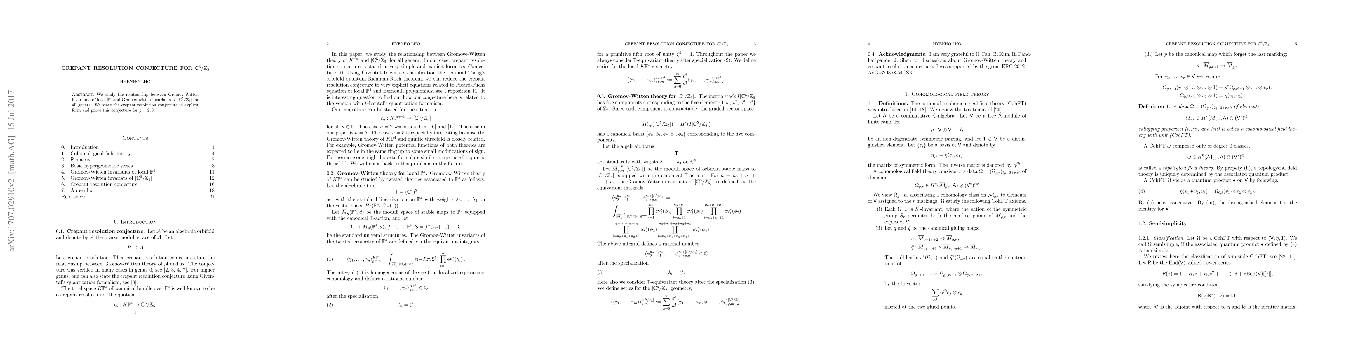 The paper investigates the connection between Gromov-Witten invariants of local $\mathbb{P}^4$ and those of $[\mathbb{C}^5/\mathbb{Z}_5]$ and proves the crepant resolution conjecture for genera $g=2$ and $3$.