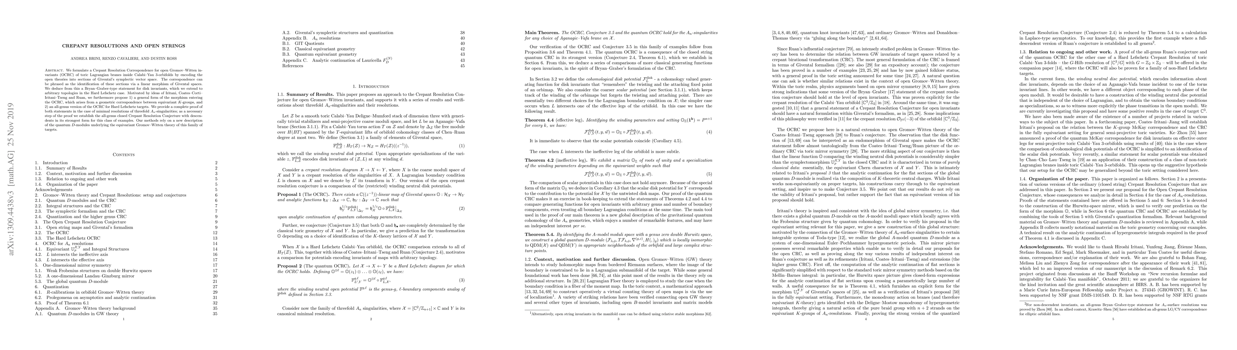 We formulate a Crepant Resolution Correspondence for open Gromov-Witten invariants (OCRC) of toric Lagrangian branes inside Calabi-Yau 3-orbifolds by encoding the open theories into sections of Givental's symplectic vector space. The correspondence can be phrased as the identification of these sections via a linear morphism of Givental spaces. We deduce from this a Bryan-Graber-type statement for disk invariants, which we extend to arbitrary topologies in the Hard Lefschetz case. Motivated by ideas of Iritani, Coates-Corti-Iritani-Tseng and Ruan, we furthermore propose 1) a general form of the morphism entering the OCRC, which arises from a geometric correspondence between equivariant K-groups, and 2) an all-genus version of the OCRC for Hard Lefschetz targets. We provide a complete proof of both statements in the case of minimal resolutions of threefold An singularities; as a necessary step of the proof we establish the all-genus closed Crepant Resolution Conjecture with descendents in its strongest form for this class of examples. Our methods rely on a new description of the quantum D-modules underlying the equivariant Gromov-Witten theory of this family of targets.