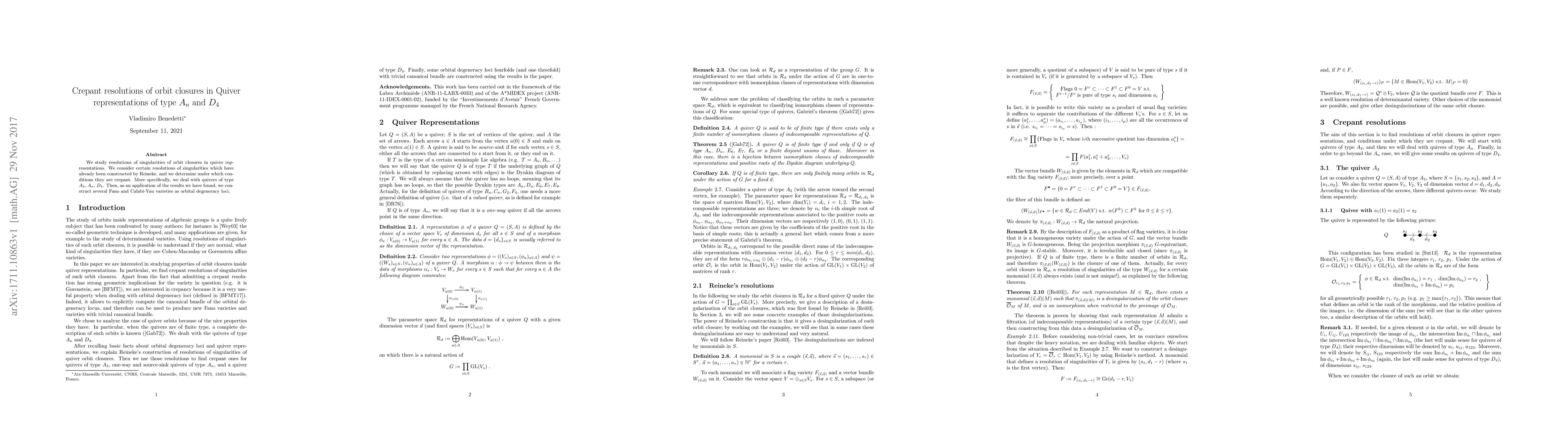 This paper investigates the crepant resolutions of singularities in orbit closures within quiver representations of types A\_n and D\_4, determining conditions under which previously constructed resolutions by Reineke are crepant. It also applies these findings to construct Fano and Calabi-Yau varieties as orbital degeneracy loci.