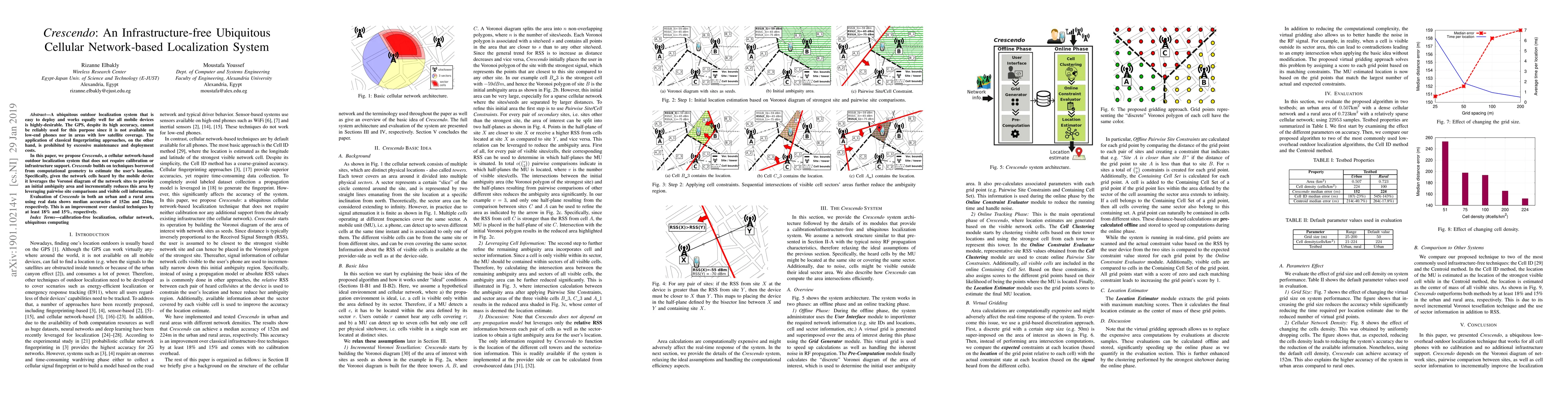 Crescendo is a cellular network-based outdoor localization system that uses Voronoi diagrams and pairwise site comparisons to estimate user location without infrastructure support or calibration. It operates in two phases: an offline phase for pre-computation and an online tracking phase for location estimation.