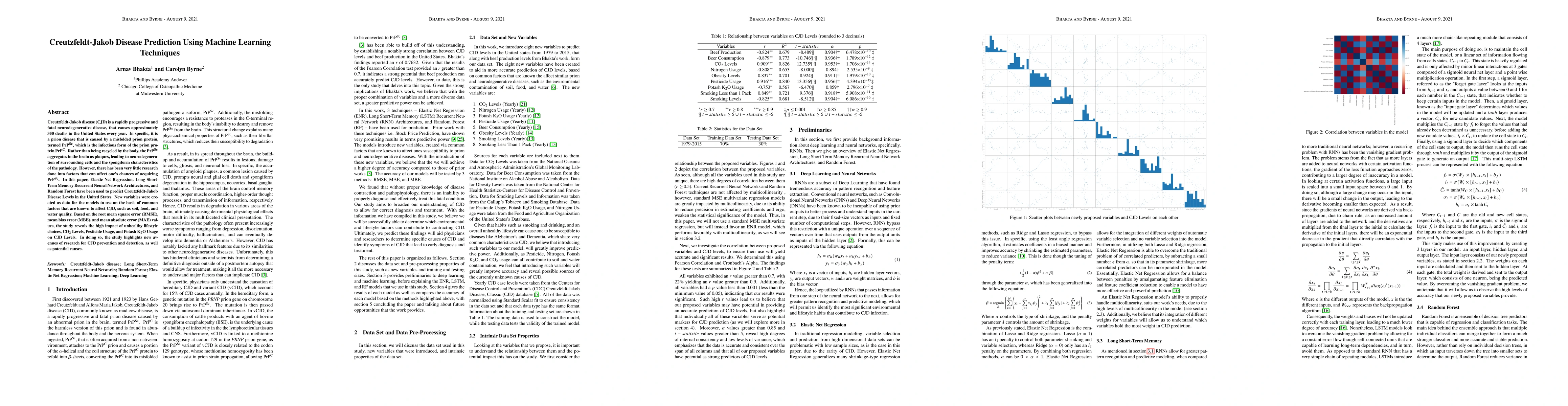 Creutzfeldt-Jakob disease (CJD) is a rapidly progressive and fatal neurodegenerative disease, that causes approximately 350 deaths in the United States every year. In specific, it is a prion disease that is caused by a misfolded prion protein, termed $PrP^{Sc}$, which is the infectious form of the prion protein $PrP^{C}$. Rather than being recycled by the body, the $PrP^{Sc}$ aggregates in the brain as plaques, leading to neurodegeneration of surrounding cells and the spongiform characteristics of the pathology. However, there has been very little research done into factors that can affect one's chances of acquiring $PrP^{Sc}$. In this paper, Elastic Net Regression, Long Short-Term Memory Recurrent Neural Network Architectures, and Random Forest have been used to predict Creutzfeldt-Jakob Disease Levels in the United States. New variables were created as data for the models to use on the basis of common factors that are known to affect CJD, such as soil, food, and water quality. Based on the root mean square error (RMSE), mean bias error (MBE), and mean absolute error (MAE) values, the study reveals the high impact of unhealthy lifestyle choices, CO$_{2}$ Levels, Pesticide Usage, and Potash K$_{2}$O Usage on CJD Levels. In doing so, the study highlights new avenues of research for CJD prevention and detection, as well as potential causes.