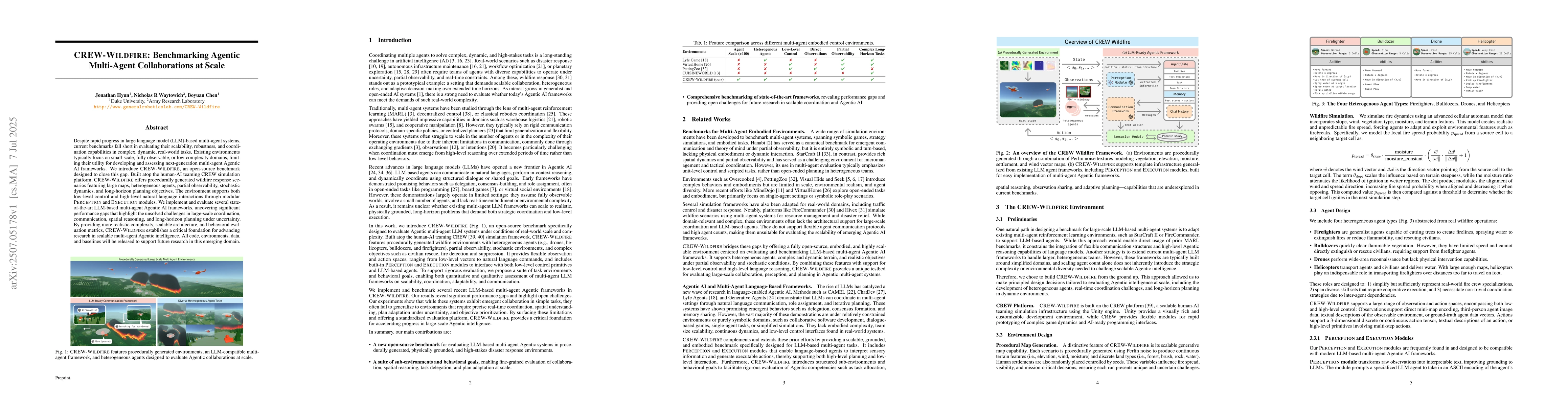 Despite rapid progress in large language model (LLM)-based multi-agent systems, current benchmarks fall short in evaluating their scalability, robustness, and coordination capabilities in complex, dynamic, real-world tasks. Existing environments typically focus on small-scale, fully observable, or low-complexity domains, limiting their utility for developing and assessing next-generation multi-agent Agentic AI frameworks. We introduce CREW-Wildfire, an open-source benchmark designed to close this gap. Built atop the human-AI teaming CREW simulation platform, CREW-Wildfire offers procedurally generated wildfire response scenarios featuring large maps, heterogeneous agents, partial observability, stochastic dynamics, and long-horizon planning objectives. The environment supports both low-level control and high-level natural language interactions through modular Perception and Execution modules. We implement and evaluate several state-of-the-art LLM-based multi-agent Agentic AI frameworks, uncovering significant performance gaps that highlight the unsolved challenges in large-scale coordination, communication, spatial reasoning, and long-horizon planning under uncertainty. By providing more realistic complexity, scalable architecture, and behavioral evaluation metrics, CREW-Wildfire establishes a critical foundation for advancing research in scalable multi-agent Agentic intelligence. All code, environments, data, and baselines will be released to support future research in this emerging domain.