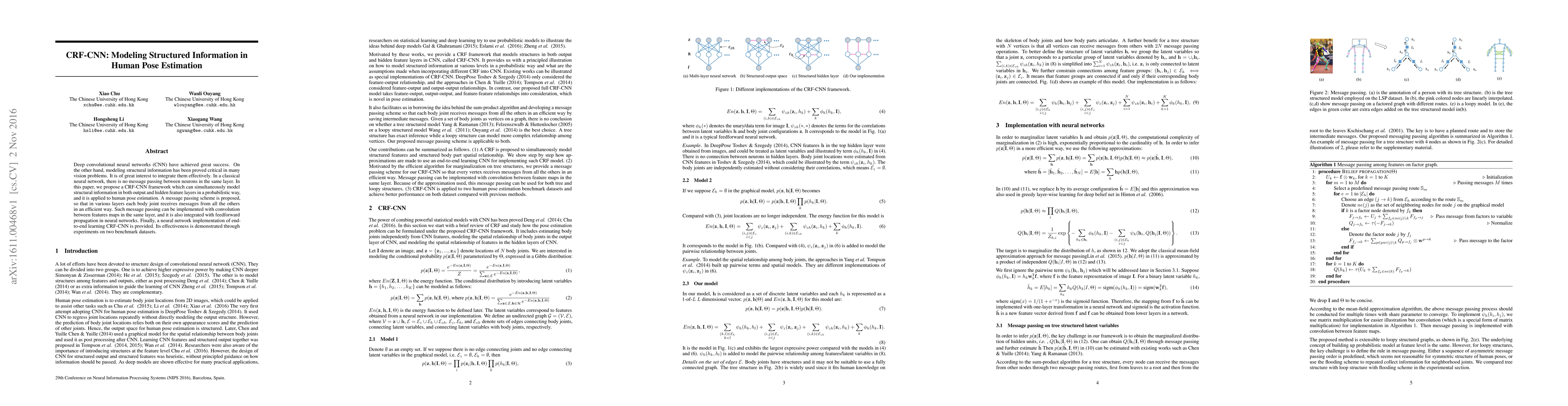 A new neural network framework, CRF-CNN, is proposed to model structural information in human pose estimation. It integrates message passing between neurons in the same layer, enabling simultaneous modeling of output and hidden feature layers.