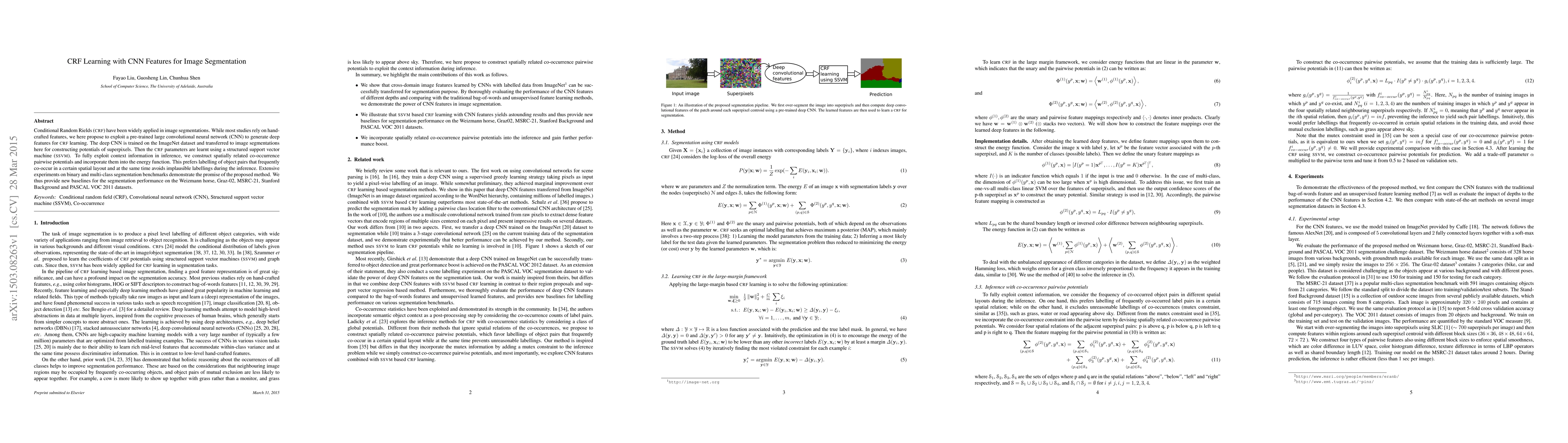 This paper proposes using deep CNN features generated from a pre-trained network for Conditional Random Fields (CRF) in image segmentation tasks, improving upon traditional hand-crafted features. The method integrates spatially related co-occurrence pairwise potentials into the CRF energy function to enhance context information, achieving better segmentation performance on multiple datasets.