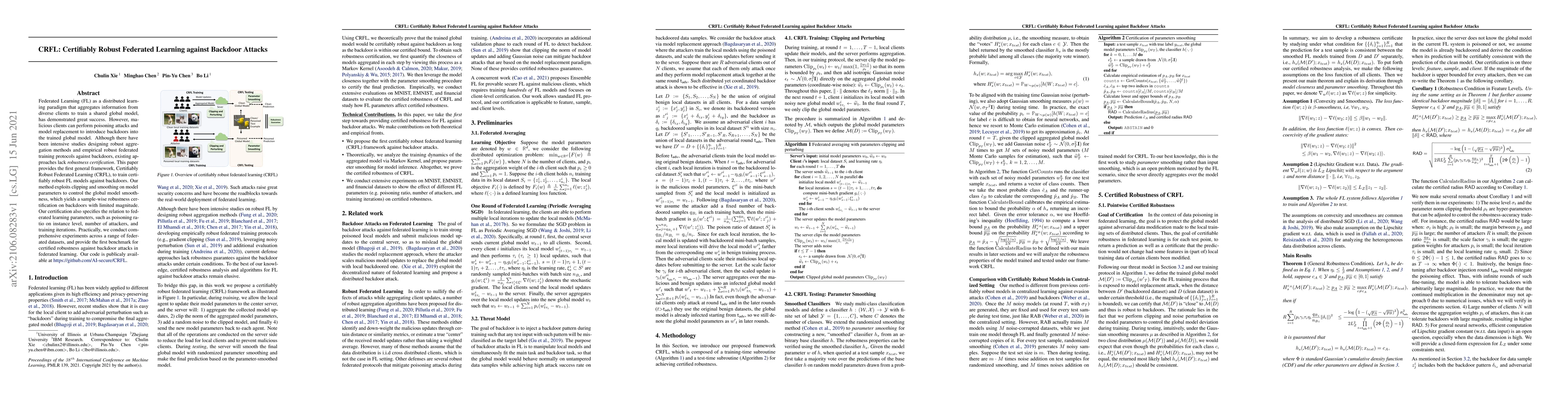 This paper introduces CRFL, a framework for certifiably robust federated learning against backdoor attacks, which employs clipping and smoothing techniques to ensure model robustness with a sample-wise certification. The method provides a benchmark for certified robustness in federated learning and is experimentally validated across various datasets.