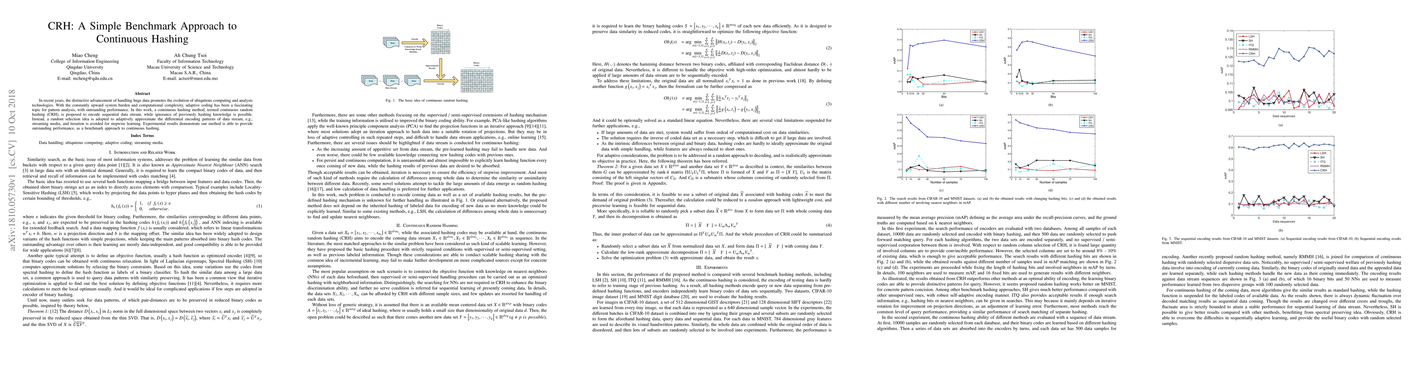 In recent years, the distinctive advancement of handling huge data promotes the evolution of ubiquitous computing and analysis technologies. With the constantly upward system burden and computational complexity, adaptive coding has been a fascinating topic for pattern analysis, with outstanding performance. In this work, a continuous hashing method, termed continuous random hashing (CRH), is proposed to encode sequential data stream, while ignorance of previously hashing knowledge is possible. Instead, a random selection idea is adopted to adaptively approximate the differential encoding patterns of data stream, e.g., streaming media, and iteration is avoided for stepwise learning. Experimental results demonstrate our method is able to provide outstanding performance, as a benchmark approach to continuous hashing.
