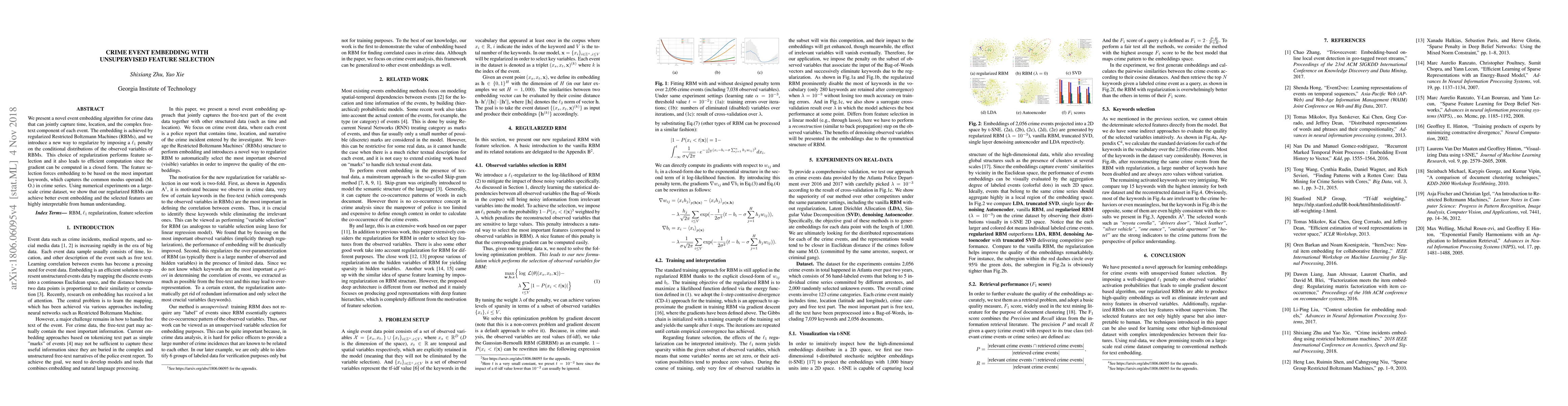 This research introduces a novel method using regularized Restricted Boltzmann Machines (RBMs) for embedding crime event data, incorporating time, location, and text. The $ell_1$ penalty on conditional distributions enables feature selection, focusing on key keywords to capture crime patterns. Experiments on a large-scale dataset demonstrate improved embedding and interpretable features.