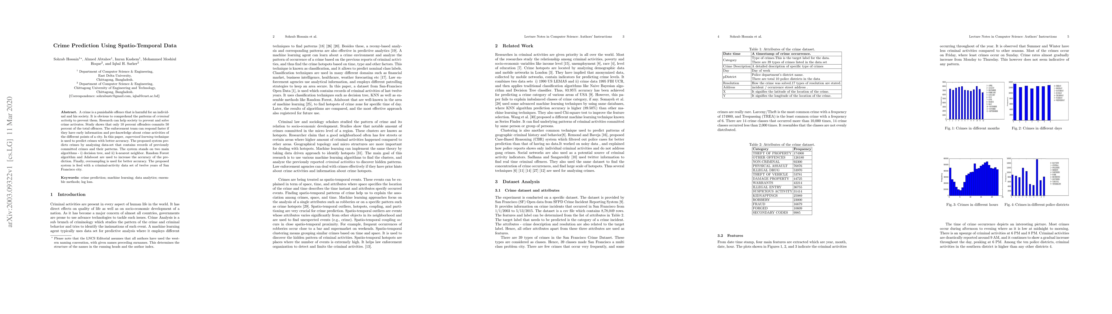 A crime is a punishable offence that is harmful for an individual and his society. It is obvious to comprehend the patterns of criminal activity to prevent them. Research can help society to prevent and solve crime activates. Study shows that only 10 percent offenders commits 50 percent of the total offences. The enforcement team can respond faster if they have early information and pre-knowledge about crime activities of the different points of a city. In this paper, supervised learning technique is used to predict crimes with better accuracy. The proposed system predicts crimes by analyzing data-set that contains records of previously committed crimes and their patterns. The system stands on two main algorithms - i) decision tree, and ii) k-nearest neighbor. Random Forest algorithm and Adaboost are used to increase the accuracy of the prediction. Finally, oversampling is used for better accuracy. The proposed system is feed with a criminal-activity data set of twelve years of San Francisco city.