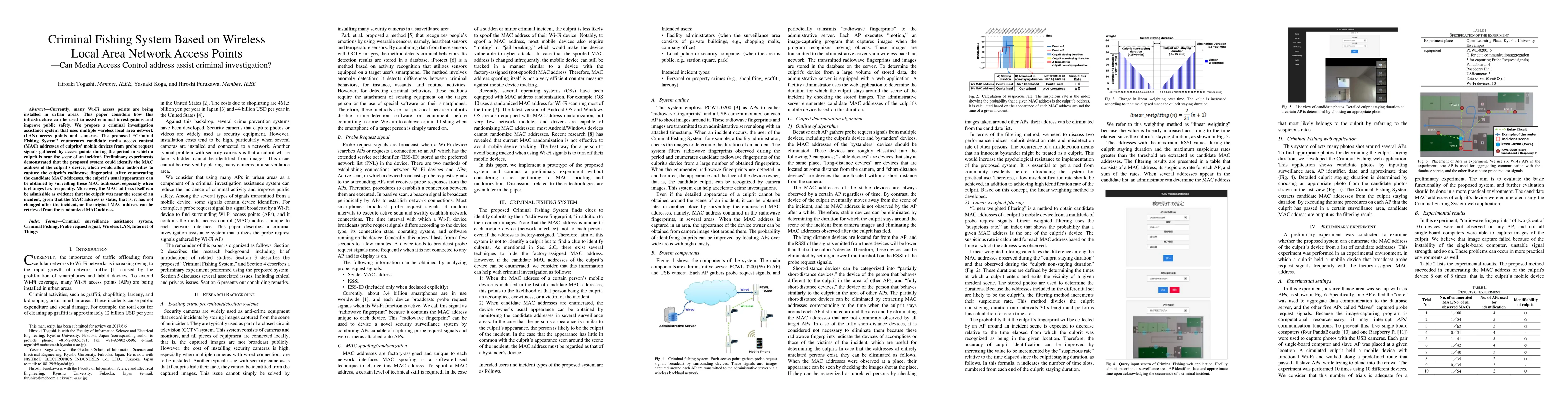 Currently, many Wi-Fi access points are being installed in urban areas. This paper considers how this infrastructure can be used to assist criminal investigations and improve public safety. We propose a criminal investigation assistance system that uses multiple wireless local area network (LAN) access points and cameras. The proposed "Criminal Fishing System" enumerates candidate media access control (MAC) addresses of culprits' mobile devices from probe request signals gathered by access points during the period in which a culprit is near the scene of an incident. Preliminary experiments demonstrated that the proposed system could identify the MAC address of the culprit's device, which would allow authorities to capture the culprit's radiowave fingerprint. After enumerating the candidate MAC addresses, the culprit's usual appearance can be obtained by surveilling these MAC addresses, especially when it changes less frequently. Moreover, the MAC address itself can be admissible as evidence that the culprit was near the scene of an incident, given that the MAC address is static, that is, it has not changed after the incident, or the original MAC address can be retrieved from the randomized MAC address.