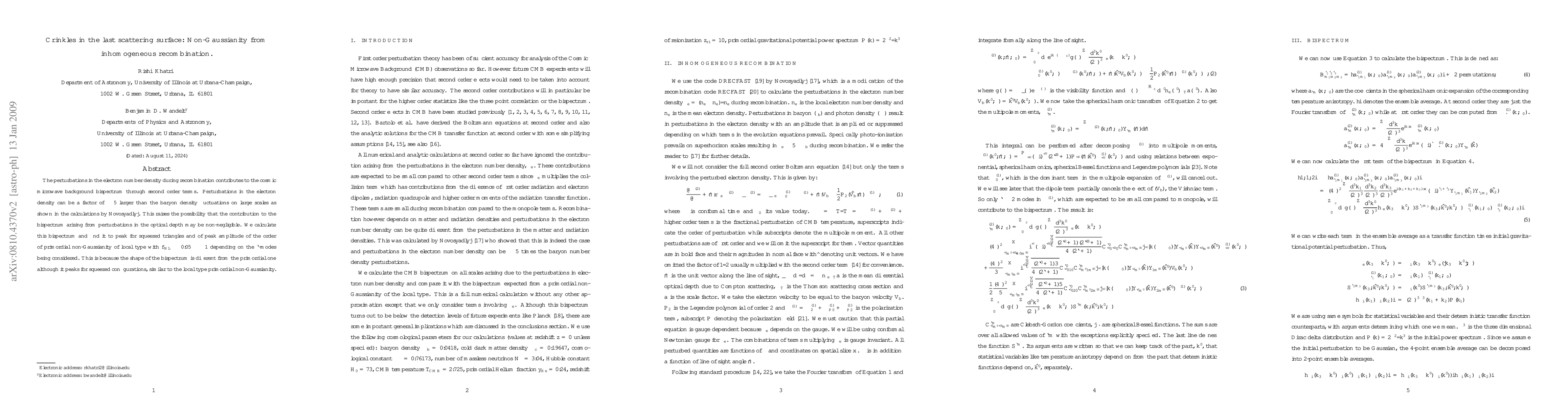 The perturbations in the electron number density during recombination contributes to the Cosmic Microwave Background bispectrum through second order terms. Perturbations in the electron density can be a factor of ~5 larger than the baryon density fluctuations on large scales as shown in the calculations by Novosyadlyj. This raises the possibility that the contribution to bispectrum arising from perturbations in the optical depth may be non-negligible. We calculate this bispectrum and find it to peak for squeezed triangles and of peak amplitude of the order of primordial non-Gaussianity of local type with fNL of 0.05 ~ -1 depending on the l-modes being considered. This is because the shape of the bispectrum is different from the primordial one although it peaks for squeezed configurations, similar to the local type primordial non-Gaussianity.