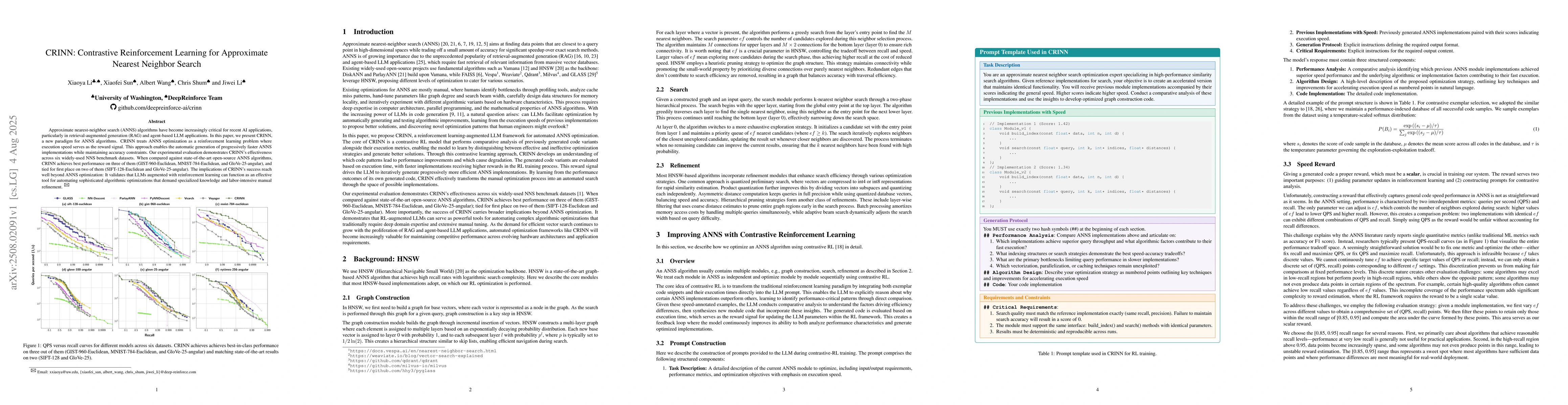 Approximate nearest-neighbor search (ANNS) algorithms have become increasingly critical for recent AI applications, particularly in retrieval-augmented generation (RAG) and agent-based LLM applications. In this paper, we present CRINN, a new paradigm for ANNS algorithms. CRINN treats ANNS optimization as a reinforcement learning problem where execution speed serves as the reward signal. This approach enables the automatic generation of progressively faster ANNS implementations while maintaining accuracy constraints. Our experimental evaluation demonstrates CRINN's effectiveness across six widely-used NNS benchmark datasets. When compared against state-of-the-art open-source ANNS algorithms, CRINN achieves best performance on three of them (GIST-960-Euclidean, MNIST-784-Euclidean, and GloVe-25-angular), and tied for first place on two of them (SIFT-128-Euclidean and GloVe-25-angular). The implications of CRINN's success reach well beyond ANNS optimization: It validates that LLMs augmented with reinforcement learning can function as an effective tool for automating sophisticated algorithmic optimizations that demand specialized knowledge and labor-intensive manual refinement.Code can be found at https://github.com/deepreinforce-ai/CRINN