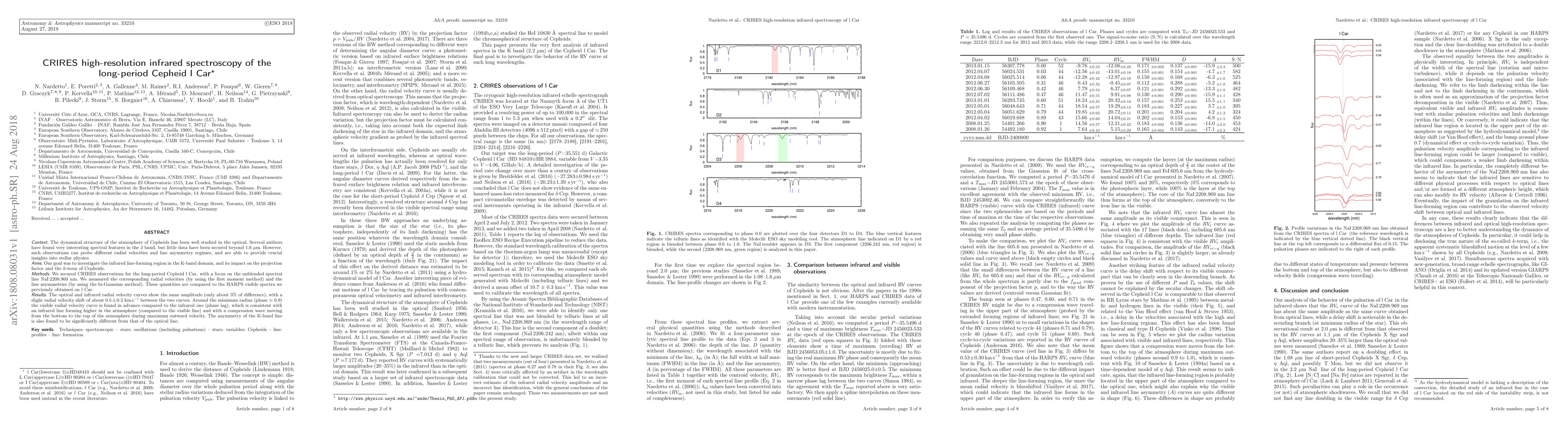The study uses CRIRES high-resolution infrared spectroscopy to analyze the long-period Cepheid l Car, focusing on the NaI 2208.969 nm spectral line in the K-band. Comparing optical (HARPS) and infrared radial velocity curves, it finds a slight shift of 0.5 +/- 0.3 km s^-1, with the infrared curve lagging in phase around minimum radius, indicating the infrared line forms higher in the atmosphere. The asymmetry of the K-band line also differs significantly from the optical line.