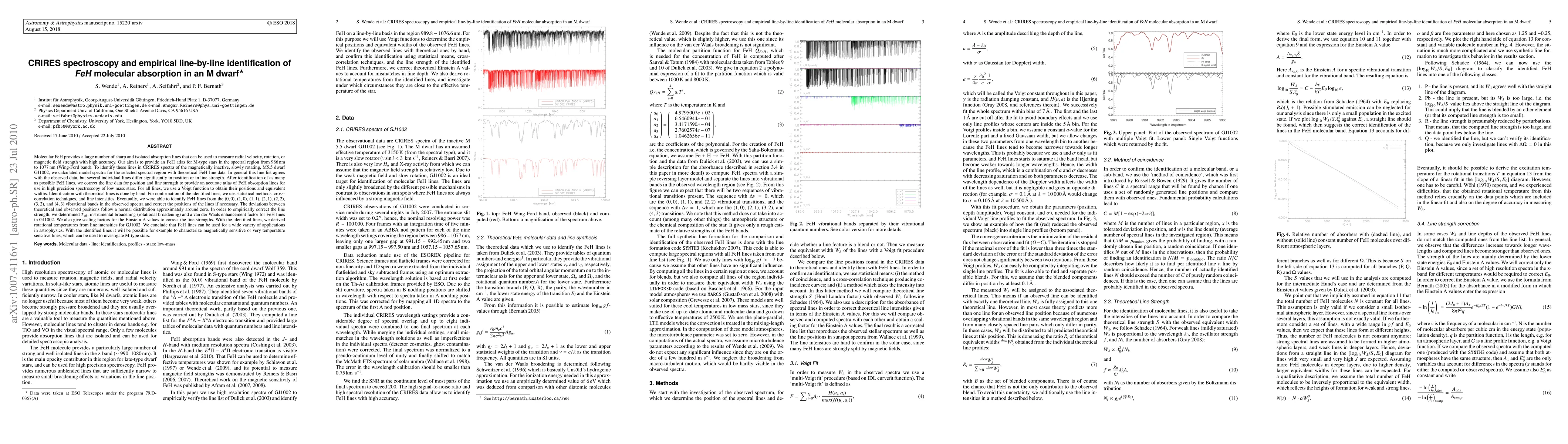 Molecular FeH provides a large number of sharp and isolated absorption lines that can be used to measure radial velocity, rotation, or magnetic field strength with high accuracy. Our aim is to provide an FeH atlas for M-type stars in the spectral region from 986 nm to 1077 nm (Wing-Ford band). To identify these lines in CRIRES spectra of the magnetically inactive, slowly rotating, M5.5 dwarf GJ1002, we calculated model spectra for the selected spectral region with theoretical FeH line data. In general this line list agrees with the observed data, but several individual lines differ significantly in position or in line strength. After identification of as many as possible FeH lines, we correct the line data for position and line strength to provide an accurate atlas of FeH absorption lines for use in high precision spectroscopy of low mass stars. For all lines, we use a Voigt function to obtain their positions and equivalent widths. Identification with theoretical lines is done by hand. For confirmation of the identified lines, we use statistical methods, cross- correlation techniques, and line intensities. Eventually, we were able to identify FeH lines from the (0, 0), (1, 0), (1, 1), (2, 1), (2, 2), (3, 2), and (4, 3) vibrational bands in the observed spectra and correct the positions of the lines if necessary. The deviations between theoretical and observed positions follow a normal distribution approximately around zero. In order to empirically correct the line strength, we determined Teff, instrumental broadening (rotational broadening) and a van der Waals enhancement factor for FeH lines in GJ1002. We also give scaling factors for the Einstein A values to correct the line strengths. With the identified lines, we derived rotational temperatures from line intensities for GJ1002. ... .