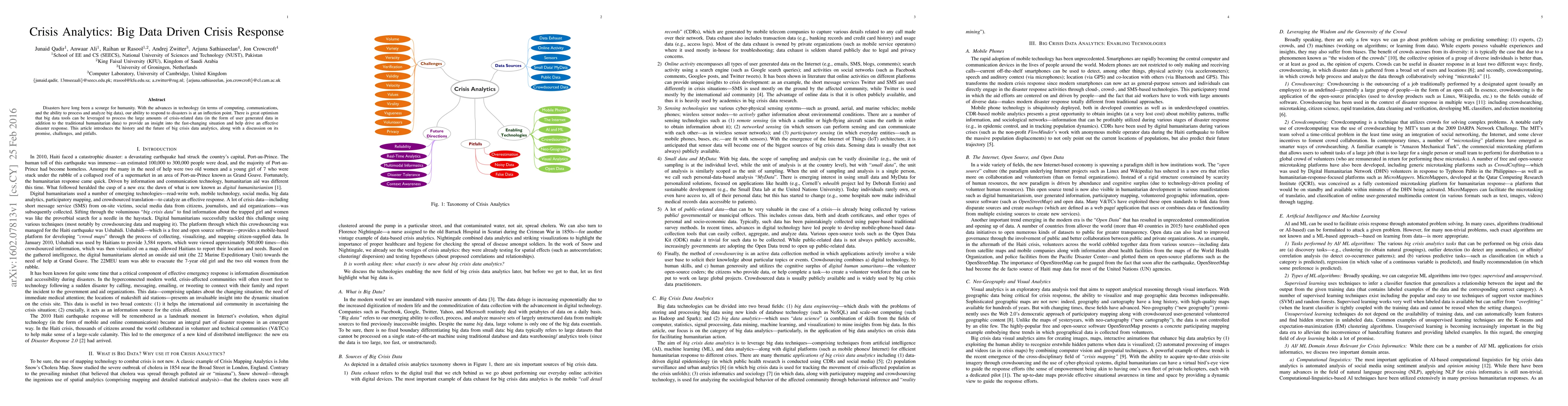 The paper discusses the history and future of big crisis data analytics, focusing on its promise, challenges, and pitfalls. It explores various data sources like Call Detail Records (CDRs), online activities, sensing technologies, small data, public-related data, and crowdsourcing for crisis response.