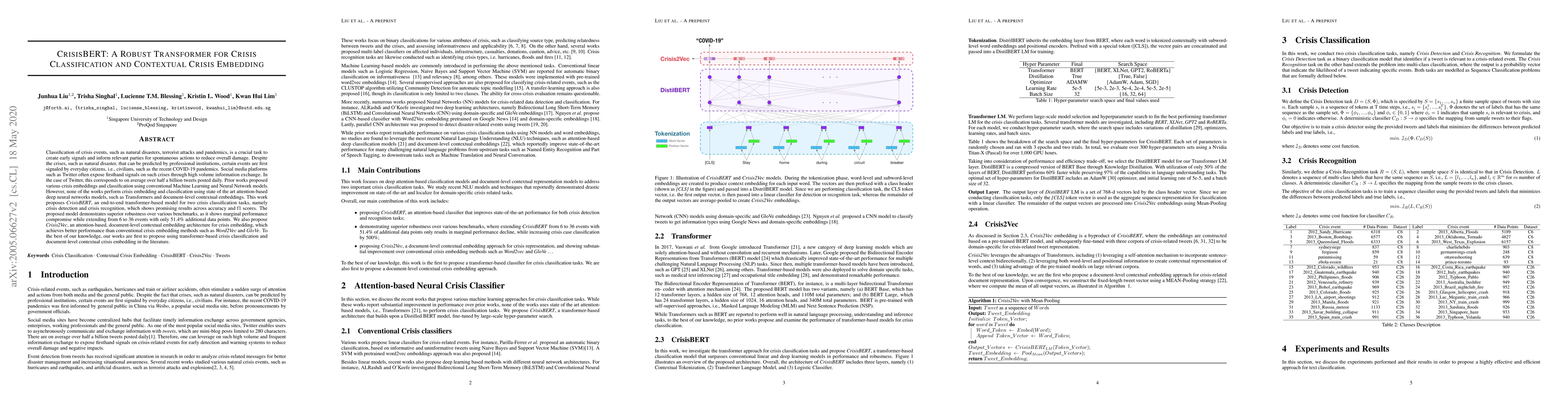 CrisisBERT is a transformer-based model for crisis classification and contextual crisis embedding, achieving high accuracy and robustness. It outperforms conventional methods and demonstrates superior performance in crisis detection and recognition tasks.