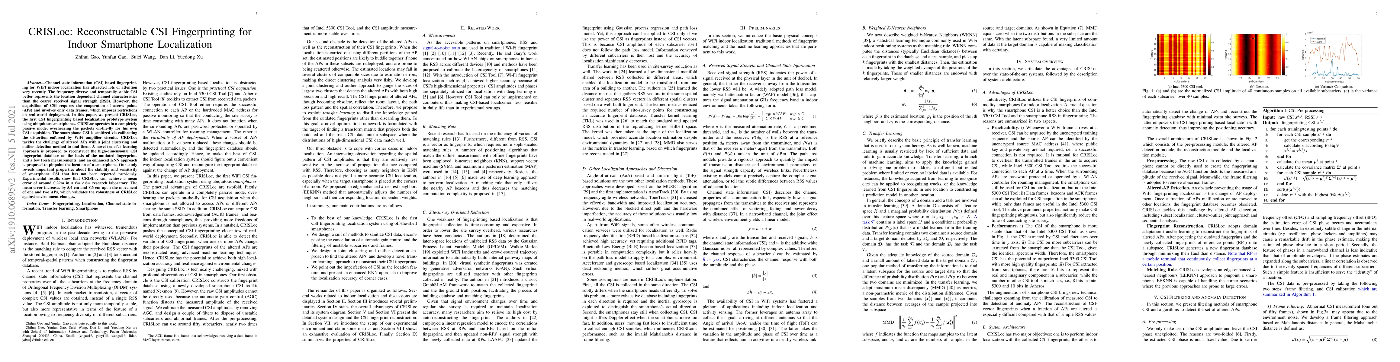 CRISLoc is a CSI fingerprinting-based localization system for smartphones that operates in a passive mode, overhearing packets for CSI acquisition. It calibrates smartphone CSI to remove distortion, uses a joint clustering and outlier detection method for altered APs, and employs a transfer learning approach for fingerprint reconstruction.
