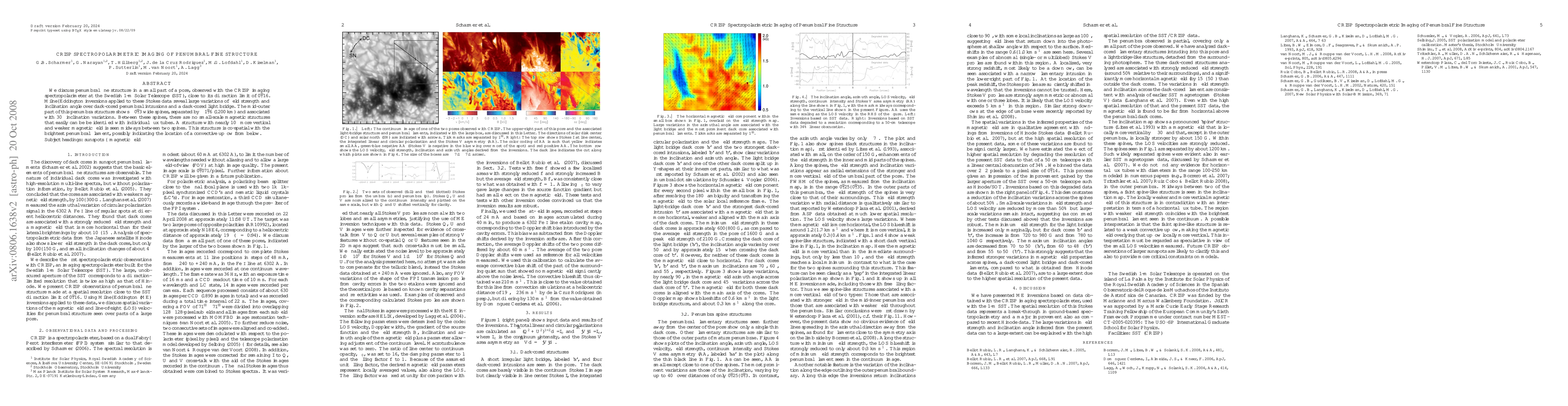 We discuss penumbral fine structure in a small part of a pore, observed with the CRISP imaging spectropolarimeter at the Swedish 1-m Solar Telescope (SST), close to its diffraction limit of 0.16 arcsec. Milne-Eddington inversions applied to these Stokes data reveal large variations of field strength and inclination angle over dark-cored penumbral intrusions and a dark-cored light bridge. The mid-outer part of this penumbra structure shows 0.3 arcsec wide spines, separated by 1.6 arcsec (1200 km) and associated with 30 deg inclination variations. Between these spines, there are no small-scale magnetic structures that easily can be be identified with individual flux tubes. A structure with nearly 10 deg more vertical and weaker magnetic field is seen midways between two spines. This structure is co-spatial with the brightest penumbral filament, possibly indicating the location of a convective upflow from below.
