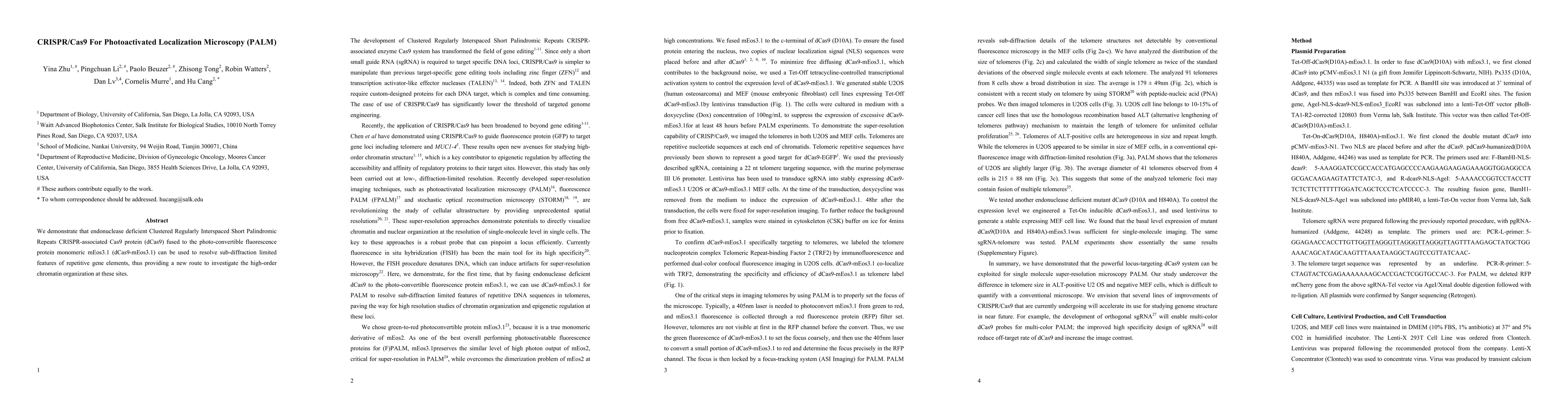 We demonstrate that endonuclease deficient Clustered Regularly Interspaced Short Palindromic Repeats CRISPR-associated Cas9 protein (dCas9) fused to the photo-convertible fluorescence protein monomeric mEos3.1 (dCas9-mEos3) can be used to resolve sub-diffraction limited features of repetitive gene elements, thus providing a new route to investigate high-order chromatin organization at these sites.
