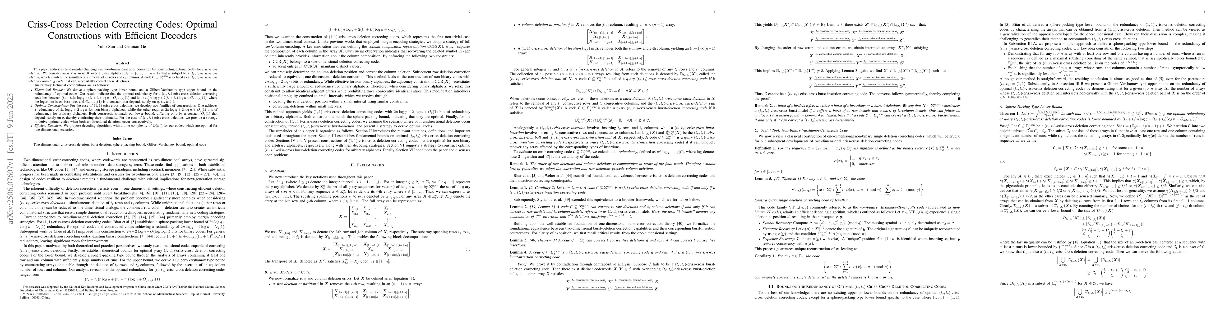 Researchers developed optimal codes for two-dimensional error correction in criss-cross deletions, with redundancy between (t_r + t_c)nlog q + (t_r + t_c)log n + O_q,t_r,t_c(1) and (t_r + t_c)nlog q + 2(t_r + t_c)log n + O_q,t_r,t_c(1), offering efficient decoders with a time complexity of O(n^2).