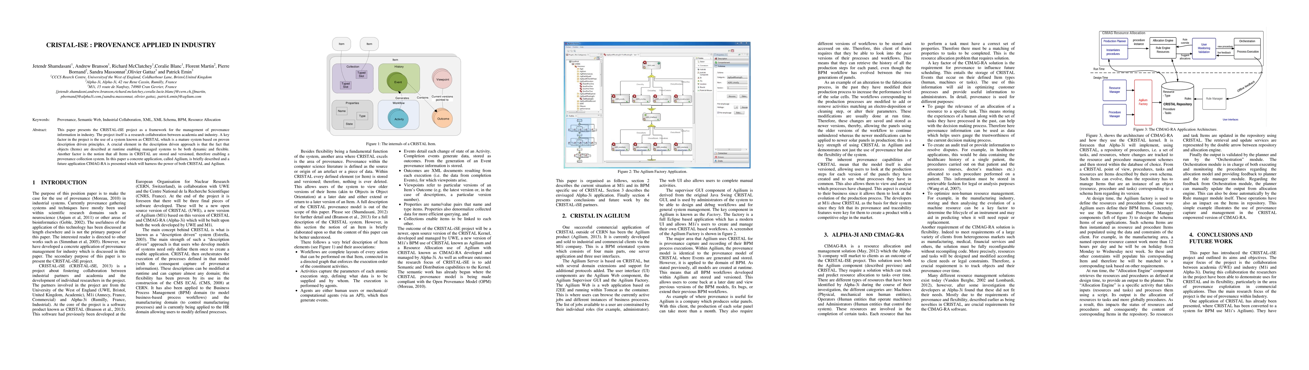The CRISTAL-iSE project aims to manage provenance information in industry using a description-driven system, CRISTAL, which allows dynamic and flexible management of objects. The project also introduces Agilium and anticipates CIMAG-RA to leverage CRISTAL's capabilities for enhanced provenance collection.