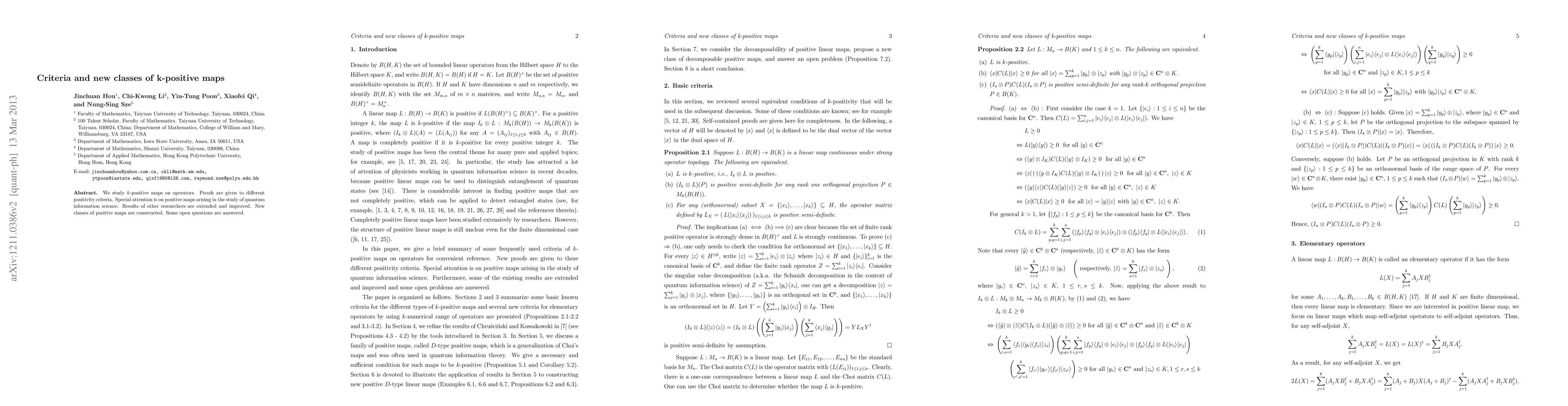 We study k-positive maps on operators. Proofs are given to different positivity criteria. Special attention is on positive maps arising in the study of quantum information science. Results of other researchers are extended and improved. New classes of positive maps are constructed. Some open questions are answered.