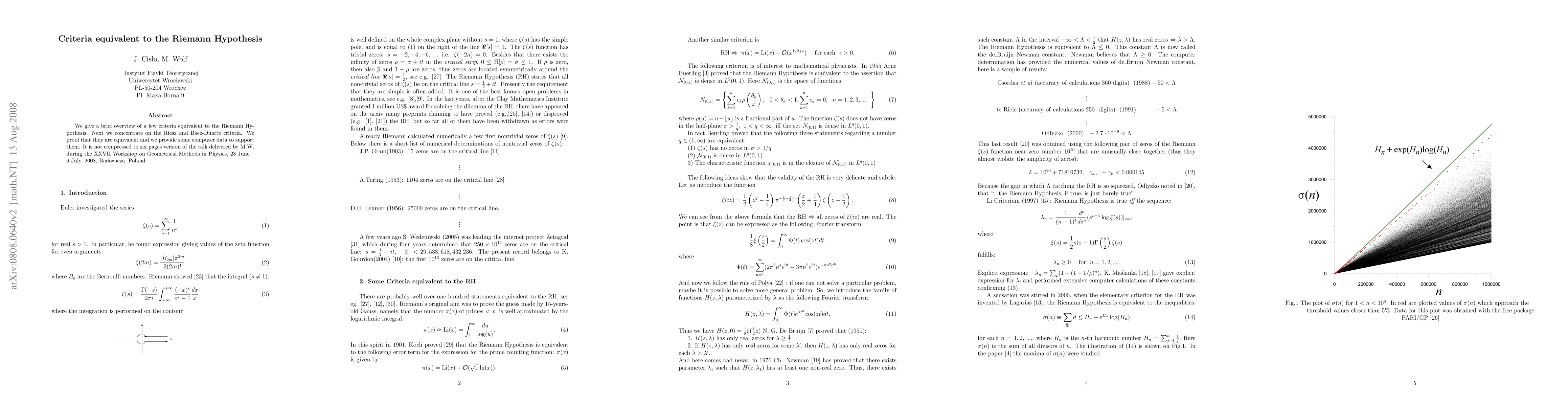 This paper provides an overview of criteria equivalent to the Riemann Hypothesis, focusing on the Riesz and Báez-Duarte criteria, and proves their equivalence with supporting computational data. The findings were presented at the XXVII Workshop on Geometrical Methods in Physics in Białystok, Poland.