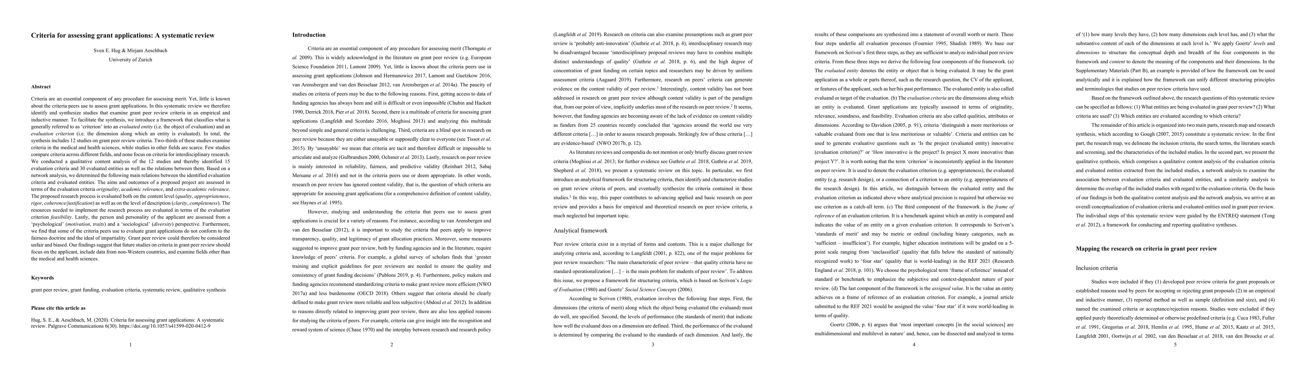 This systematic review identifies and synthesizes empirical studies on criteria used in grant peer review, classifying them into evaluated entities and evaluation criteria. The analysis reveals 15 criteria and 30 entities, proposing a conceptual framework grouping them into aims, means, and outcomes, and suggesting future research should broaden its scope beyond medical and health sciences.