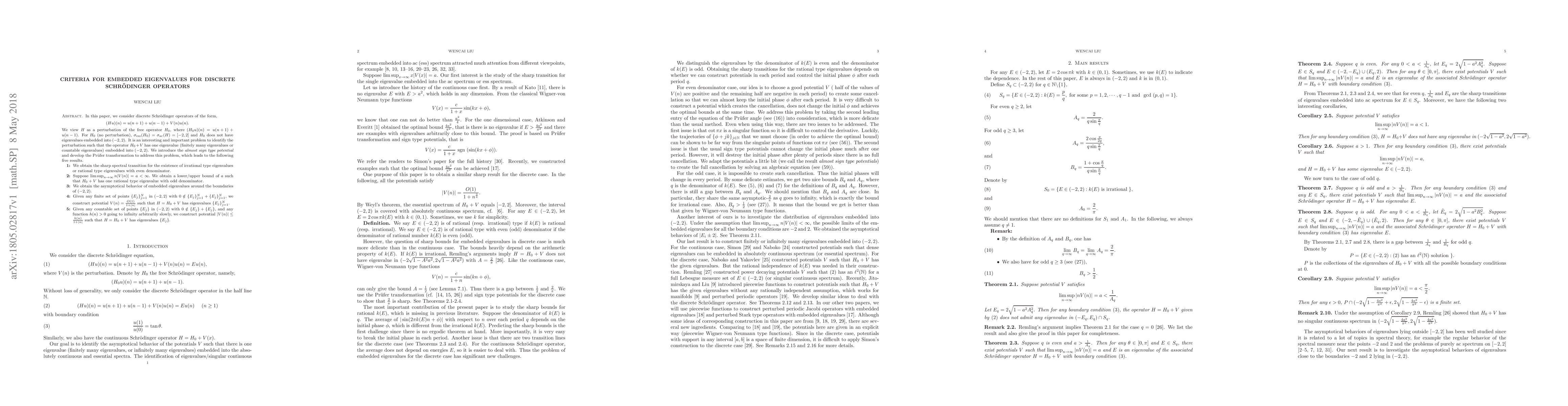 In this paper, we consider discrete Schr\"odinger operators of the form, \begin{equation*} (Hu)(n)= u({n+1})+u({n-1})+V(n)u(n). \end{equation*} We view $H$ as a perturbation of the free operator $H_0$, where $(H_0u)(n)= u({n+1})+u({n-1})$. For $H_0$ (no perturbation), $\sigma_{\rm ess}(H_0)=\sigma_{\rm ac}(H)=[-2,2]$ and $H_0$ does not have eigenvalues embedded into $(-2,2)$. It is an interesting and important problem to identify the perturbation such that the operator $H_0+V$ has one eigenvalue (finitely many eigenvalues or countable eigenvalues) embedded into $(-2,2)$. We introduce the {\it almost sign type potential } and develop the Pr\"ufer transformation to address this problem, which leads to the following five results. \begin{description} \item[1] We obtain the sharp spectral transition for the existence of irrational type eigenvalues or rational type eigenvalues with even denominator. \item[2] Suppose $\limsup_{n\to \infty} n|V(n)|=a<\infty.$ We obtain a lower/upper bound of $a$ such that $H_0+V$ has one rational type eigenvalue with odd denominator. \item[3] We obtain the asymptotical behavior of embedded eigenvalues around the boundaries of $(-2,2)$. \item [4]Given any finite set of points $\{ E_j\}_{j=1}^N$ in $(-2,2)$ with $0\notin \{ E_j\}_{j=1}^N+\{ E_j\}_{j=1}^N$, we construct potential $V(n)=\frac{O(1)}{1+|n|}$ such that $H=H_0+V$ has eigenvalues $\{ E_j\}_{j=1}^N$. \item[5]Given any countable set of points $\{ E_j\}$ in $(-2,2)$ with $0\notin \{ E_j\}+\{ E_j\}$, and any function $h(n)>0$ going to infinity arbitrarily slowly, we construct potential $|V(n)|\leq \frac{h(n)}{1+|n|}$ such that $H=H_0+V$ has eigenvalues $\{ E_j\}$. \end{description}