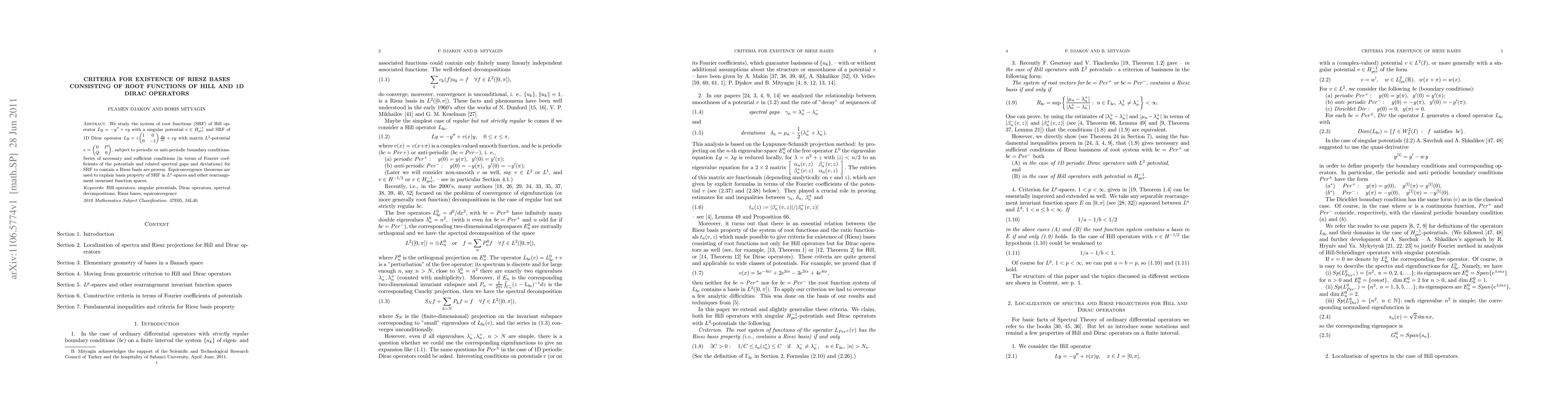 We study the system of root functions (SRF) of Hill operator $Ly = -y^{\prime \prime} +vy $ with a singular potential $v \in H^{-1}_{per}$ and SRF of 1D Dirac operator $ Ly = i {pmatrix} 1 & 0 0 & -1 {pmatrix} \frac{dy}{dx} + vy $ with matrix $L^2$-potential $v={pmatrix} 0 & P Q & 0 {pmatrix},$ subject to periodic or anti-periodic boundary conditions. Series of necessary and sufficient conditions (in terms of Fourier coefficients of the potentials and related spectral gaps and deviations) for SRF to contain a Riesz basis are proven. Equiconvergence theorems are used to explain basis property of SRF in $L^p$-spaces and other rearrangement invariant function spaces.