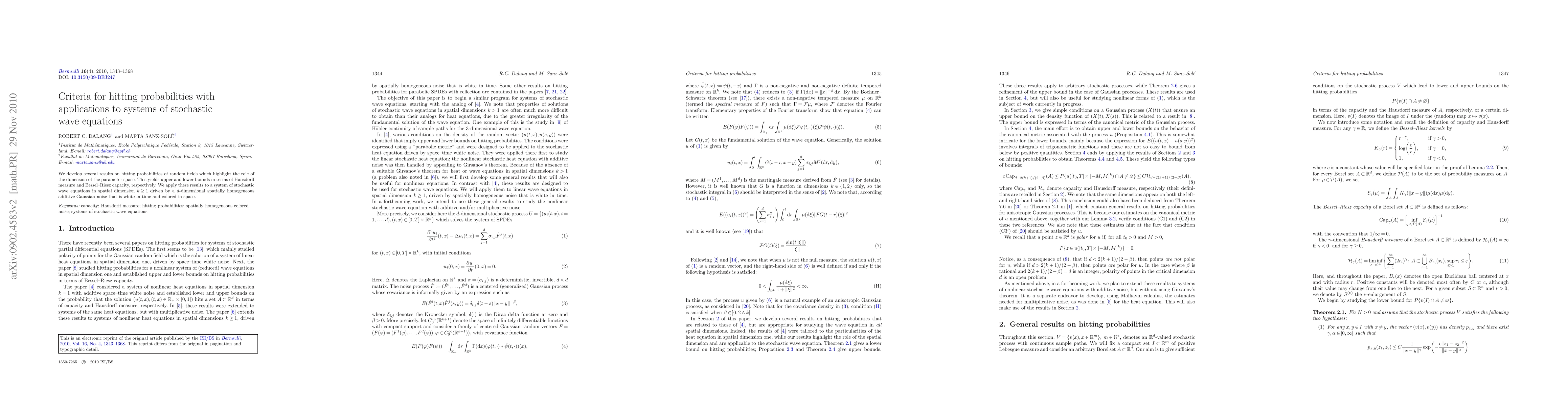 This paper develops criteria for hitting probabilities of random fields, establishing upper and lower bounds linked to Hausdorff measure and Bessel-Riesz capacity. It applies these findings to stochastic wave equations in spatial dimensions driven by spatially homogeneous Gaussian noise.