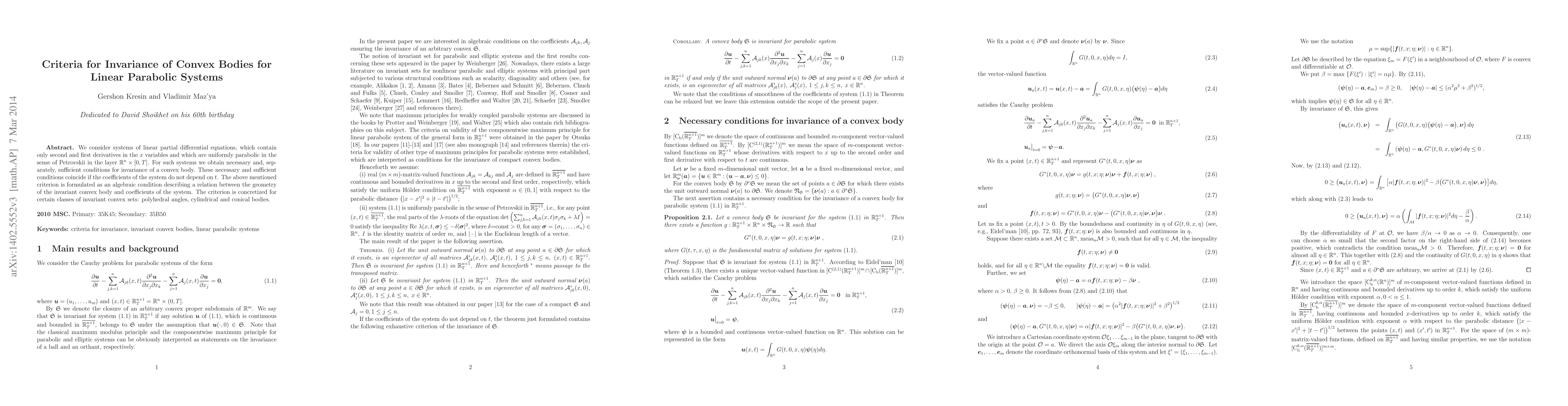 We consider systems of linear partial differential equations, which contain only second and first derivatives in the $x$ variables and which are uniformly parabolic in the sense of Petrovski\v{\i} in the layer ${\mathbb R}^n\times [0,T]$. For such systems we obtain necessary and, separately, sufficient conditions for invariance of a convex body. These necessary and sufficient conditions coincide if the coefficients of the system do not depend on $t$. The above mentioned criterion is formulated as an algebraic condition describing a relation between the geometry of the invariant convex body and coefficients of the system. The criterion is concretized for certain classes of invariant convex sets: polyhedral angles, cylindrical and conical bodies.