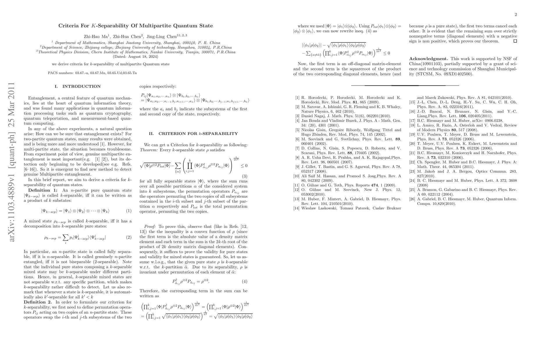 This paper establishes criteria for determining the $k$-separability of multipartite quantum states, providing a framework for assessing the entanglement properties within these complex quantum systems. The derived criteria are essential for understanding and classifying quantum states in quantum information theory.