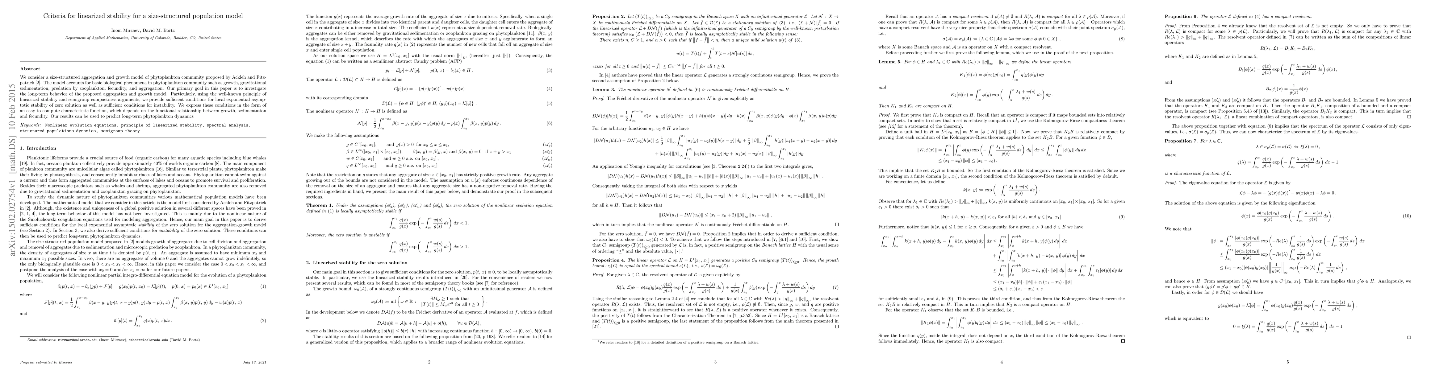 This paper investigates the linearized stability criteria for a size-structured phytoplankton model, providing conditions for local exponential stability and instability using semigroup compactness arguments. The results are expressed through a characteristic function that simplifies the analysis of growth, sedimentation, and fecundity relationships.