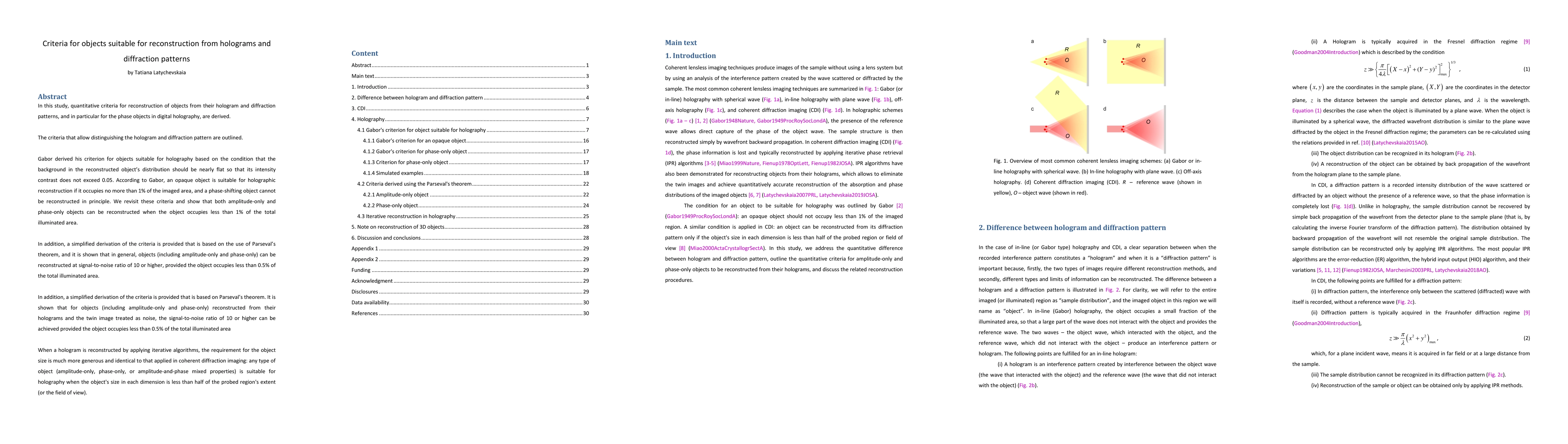 In this study, quantitative criteria for reconstruction of objects from their hologram and diffraction patterns, and in particular for the phase objects in digital holography, are derived. The criteria that allow distinguishing the hologram and diffraction pattern are outlined. Gabor derived his criterion for objects suitable for holography based on the condition that the background in the reconstructed object's distribution should be nearly flat so that its intensity contrast does not exceed 0.05.According to Gabor, an opaque object is suitable for holographic reconstruction if it occupies no more than 0.01 of the imaged area, and a phase-shifting object cannot be reconstructed in principle. We revisit these criteria and show that both types of objects can be reconstructed when the object occupies less than 0.01 of the total illuminated area. In addition, a simplified derivation of the criteria is provided that is based on the use of Parseval's theorem, and it is shown that in general, objects (including amplitude-only and phase-only) can be reconstructed at signal-to-noise ratio of 10 or higher, provided the object occupies less than 0.005 of the total illuminated area. In addition, a simplified derivation of the criteria is provided that is based on Parseval's theorem. It is shown that for objects reconstructed from their holograms and the twin image treated as noise, the signal-to-noise ratio of 10 or higher can be achieved provided the object occupies less than 0.005 of the total illuminated area When a hologram is reconstructed by applying iterative algorithms, the requirement for the object size is much more generous and identical to that applied in coherent diffraction imaging: any type of object (amplitude-only, phase-only, or amplitude-and-phase mixed properties) is suitable for holography when the object's size in each dimension is less than half of the probed region's extent.